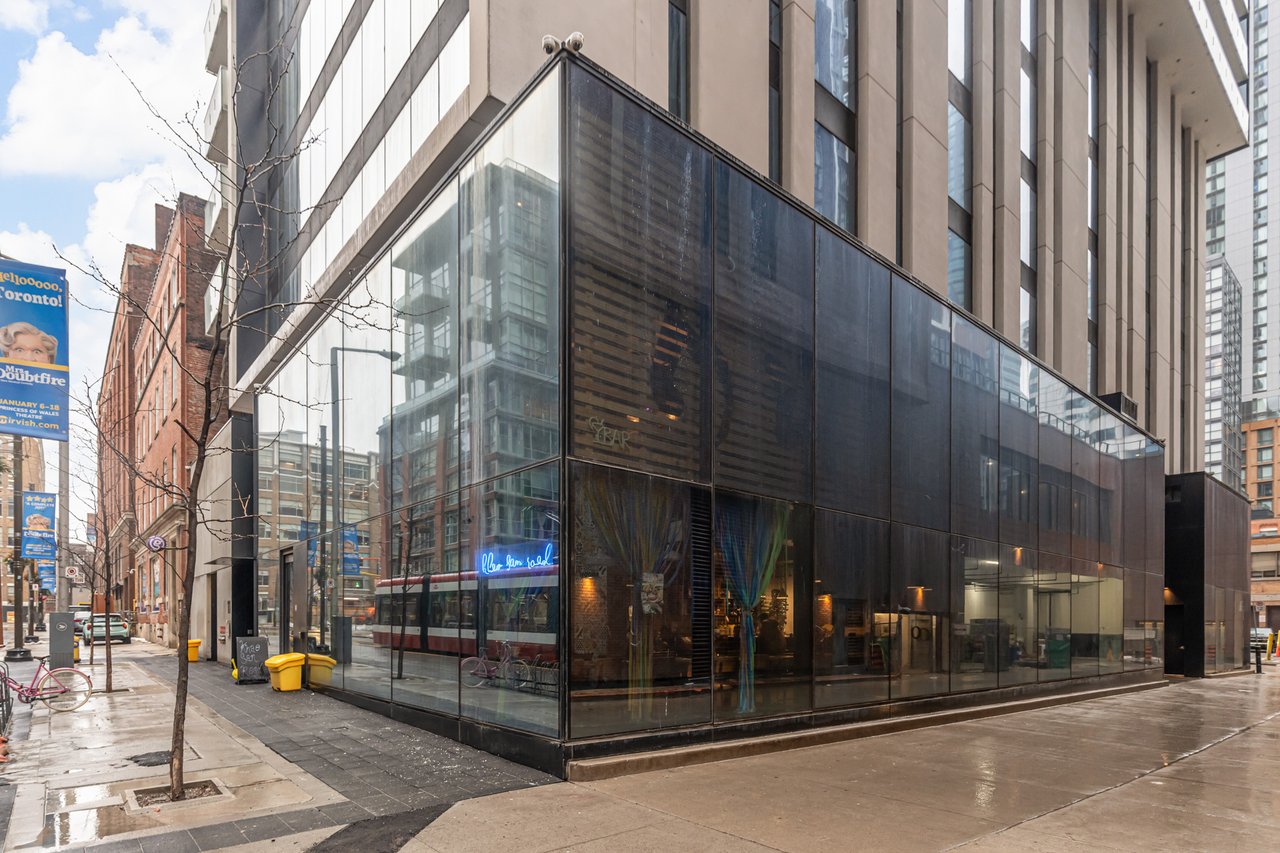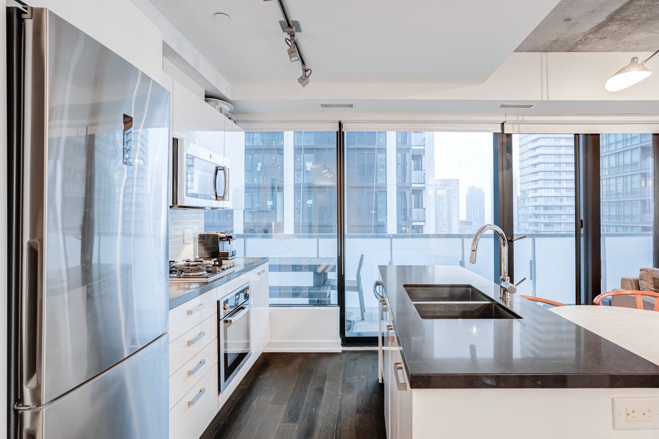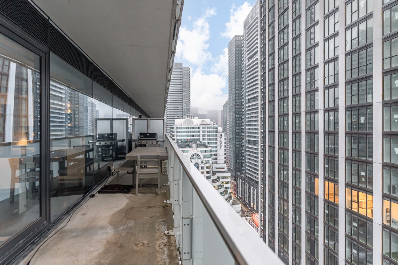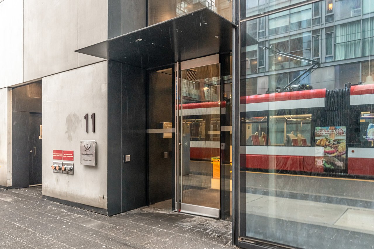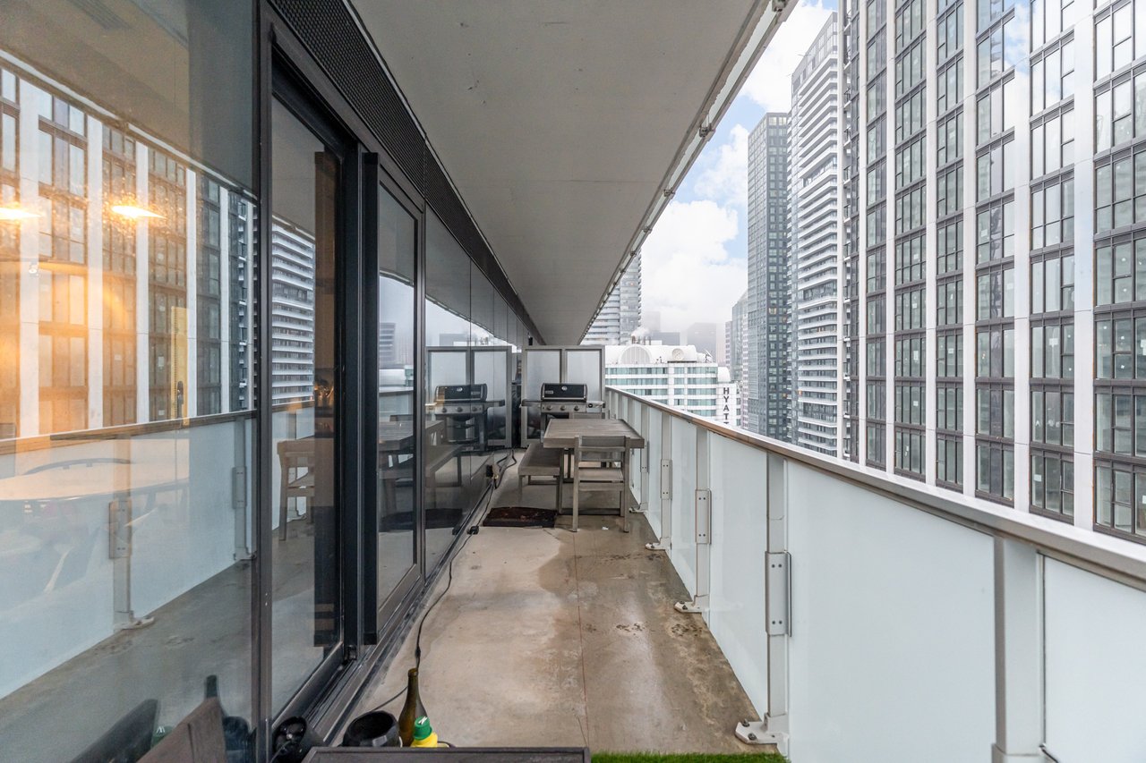 Soft Loft Dreams Are Made Of These! Welcome To The King Charlotte - Located In The Heart Of The Entertainment District. Beautifully Appointed 2 Bedroom, 2 Full Bathroom Suite - Boasting A Highly Sought After Split Floor Plan. Situated On The South West Corner Of The Building Offering An Abundance Of Natural Light With Sweeping Cityscape & Lake Ontario Views! Enjoy Oversized Balcony, Spanning The Length Of The Unit - Outfitted With Gas BBQ. Exposed Concrete Ceilings & Floor To Ceiling Windows Throughout. All Light Fixtures & Window Coverings Included. Primary Bedroom Offers Large Closet & 4pc Ensuite Bathroom. 1 Underground Parking Included. Building Is Rich In Amenities: Rooftop Tanning Deck & Outdoor Pool, State Of The Art Fitness Centre, 24hr Concierge, Party Room & Much More.