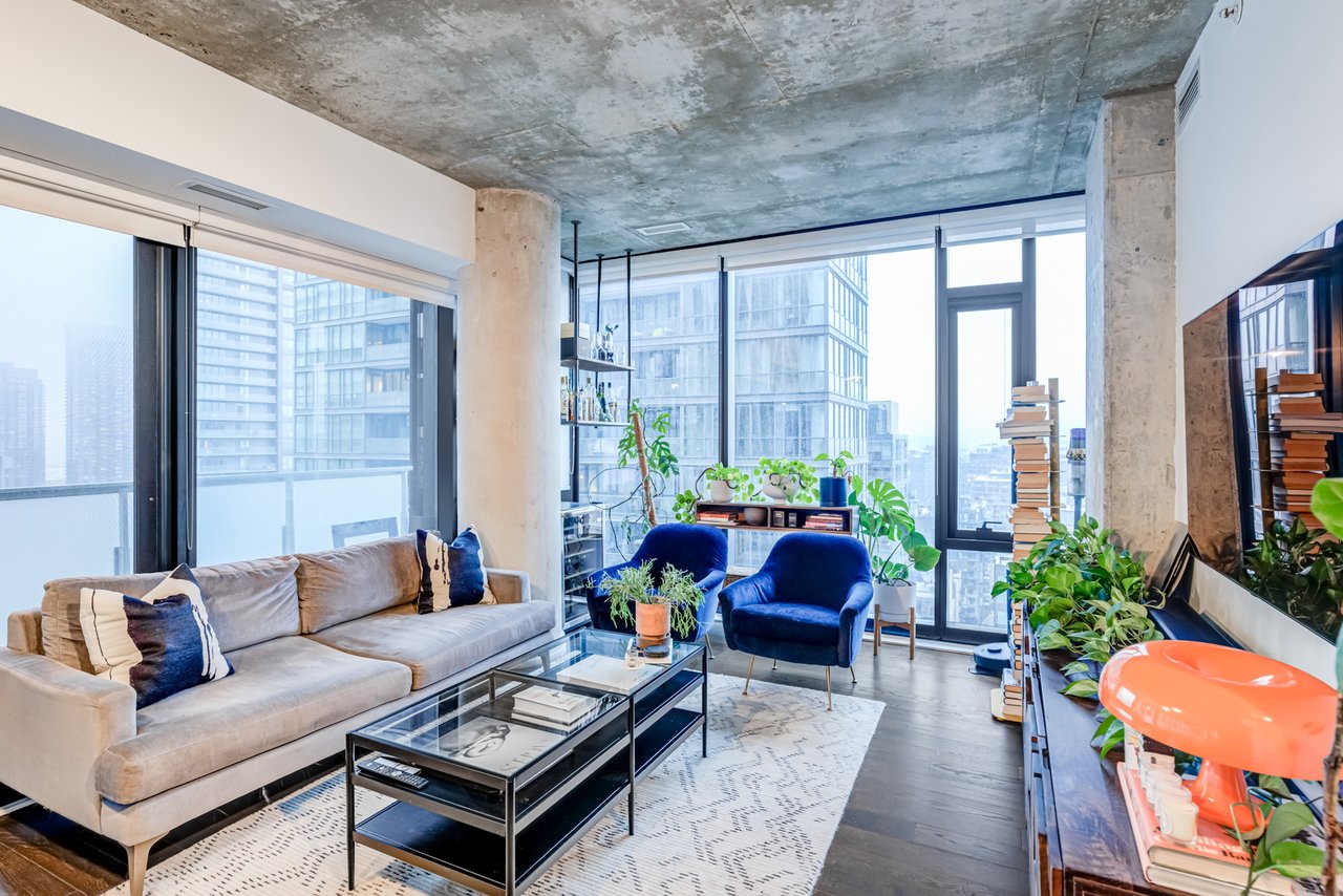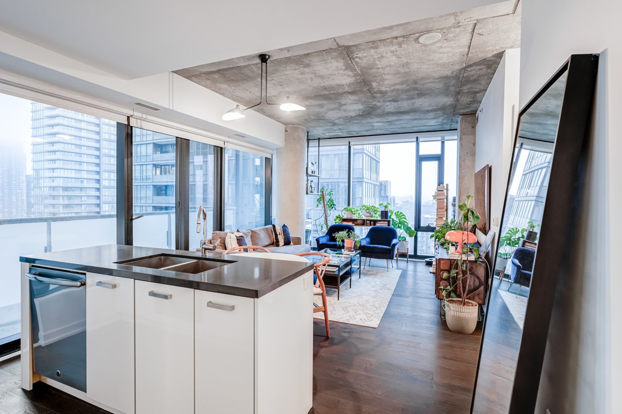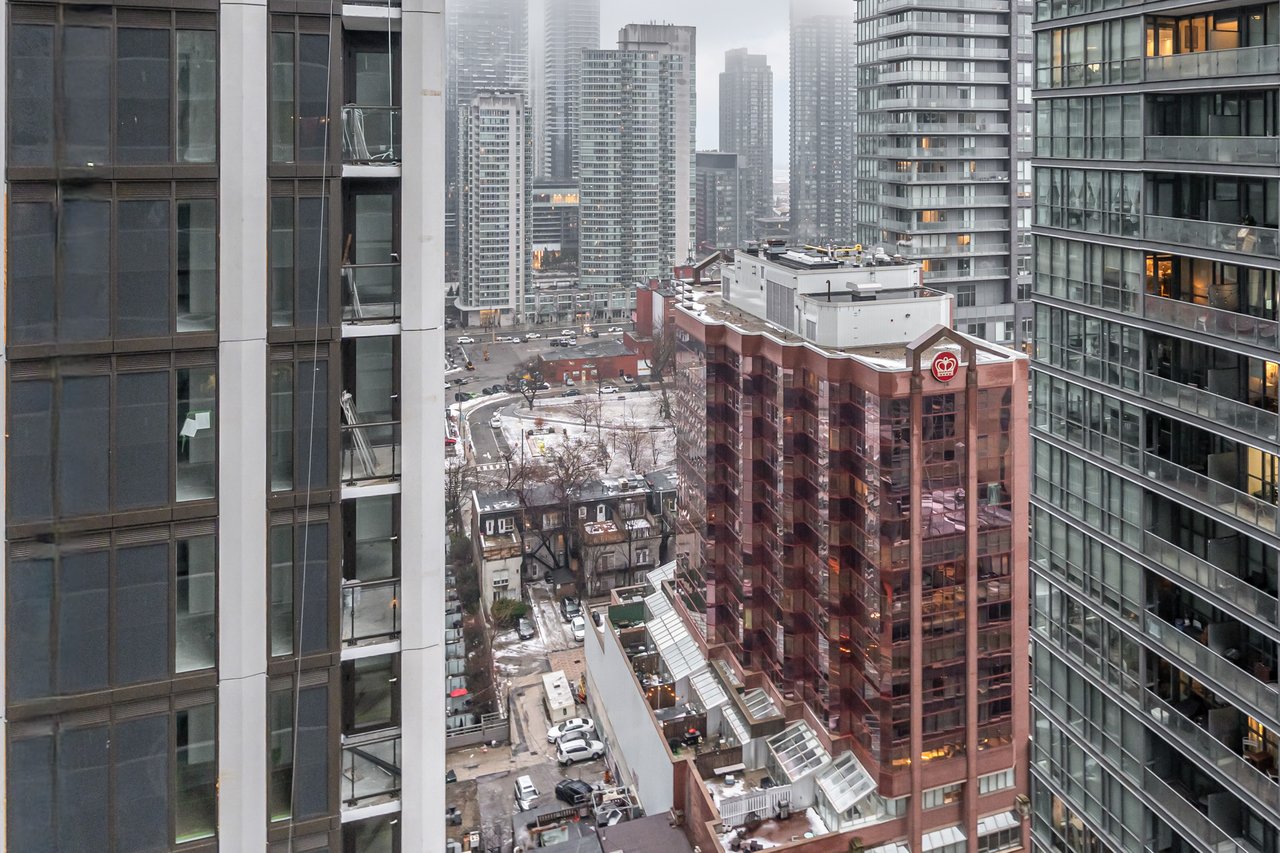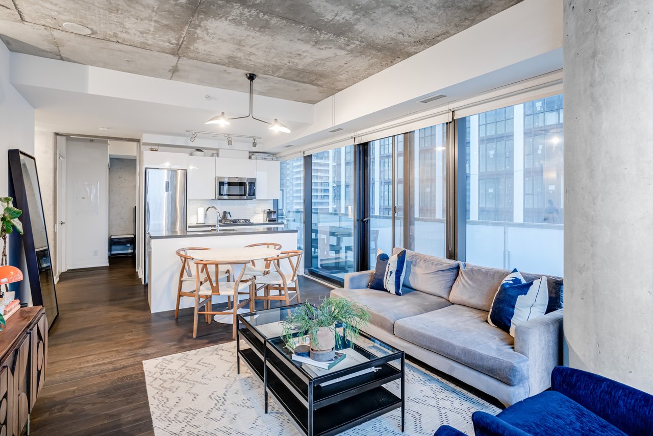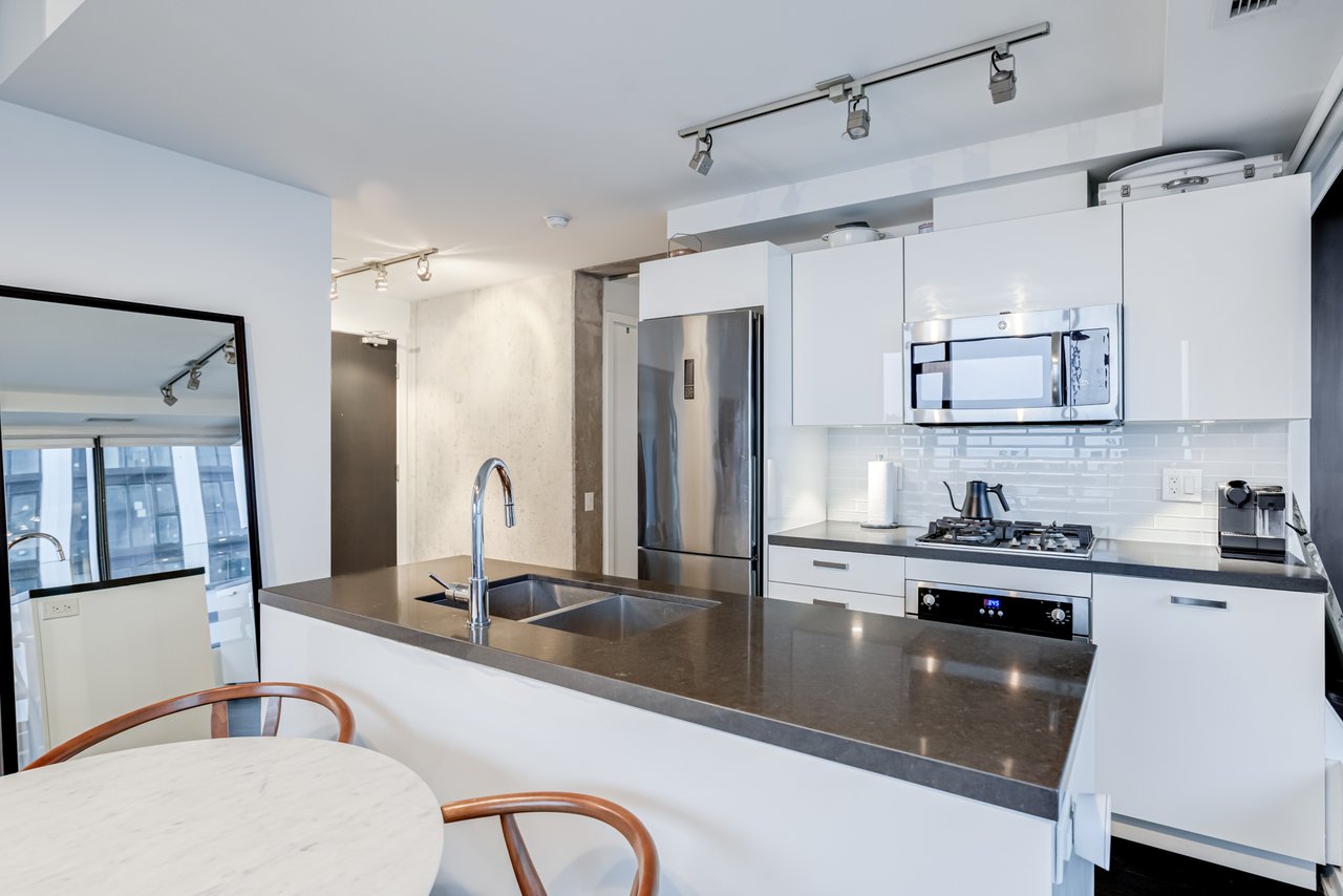 Soft Loft Dreams Are Made Of These! Welcome To The King Charlotte - Located In The Heart Of The Entertainment District. Beautifully Appointed 2 Bedroom, 2 Full Bathroom Suite - Boasting A Highly Sought After Split Floor Plan. Situated On The South West Corner Of The Building Offering An Abundance Of Natural Light With Sweeping Cityscape & Lake Ontario Views! Enjoy Oversized Balcony, Spanning The Length Of The Unit - Outfitted With Gas BBQ. Exposed Concrete Ceilings & Floor To Ceiling Windows Throughout. All Light Fixtures & Window Coverings Included. Primary Bedroom Offers Large Closet & 4pc Ensuite Bathroom. 1 Underground Parking Included. Building Is Rich In Amenities: Rooftop Tanning Deck & Outdoor Pool, State Of The Art Fitness Centre, 24hr Concierge, Party Room & Much More.