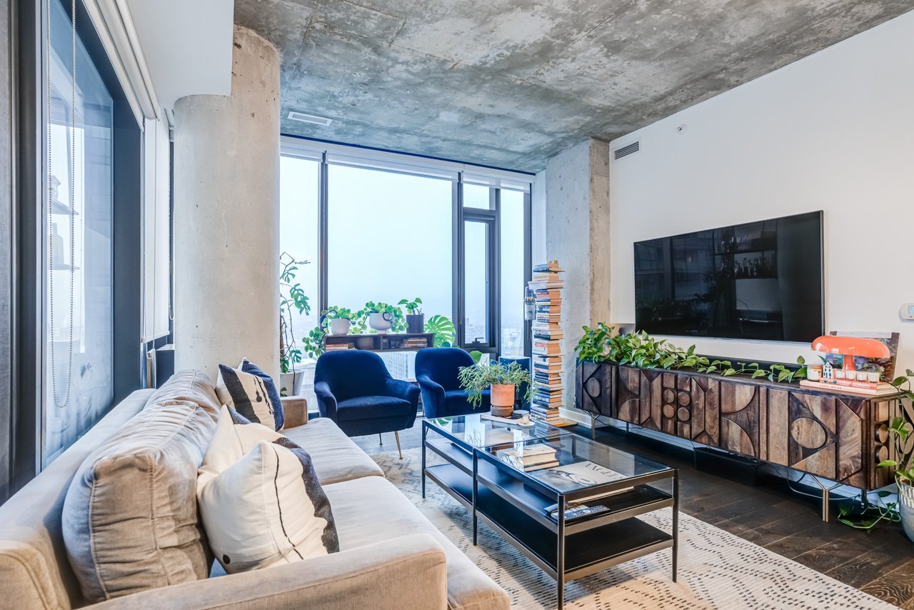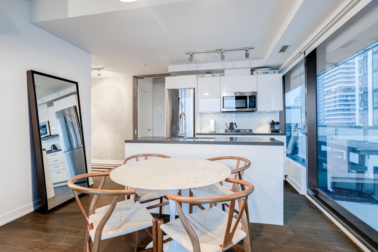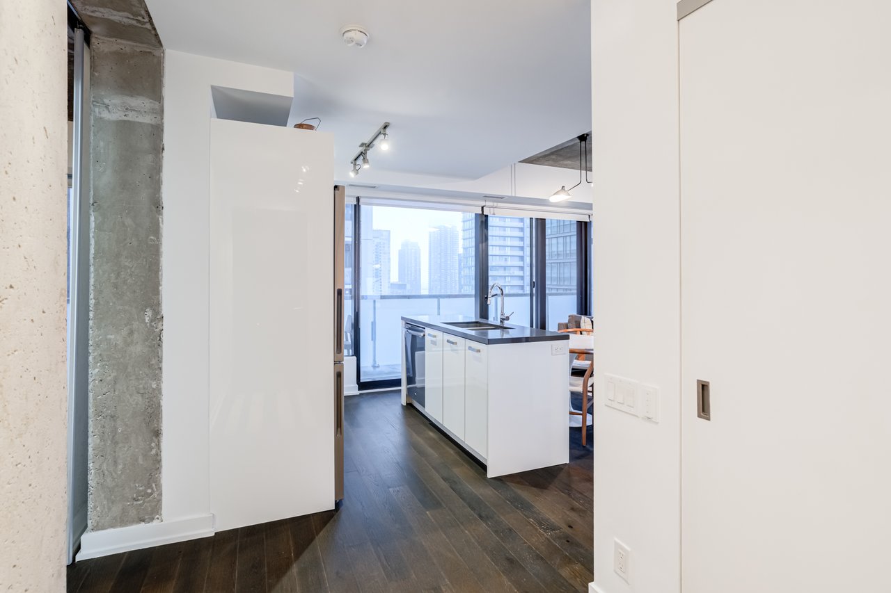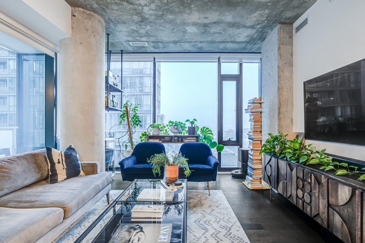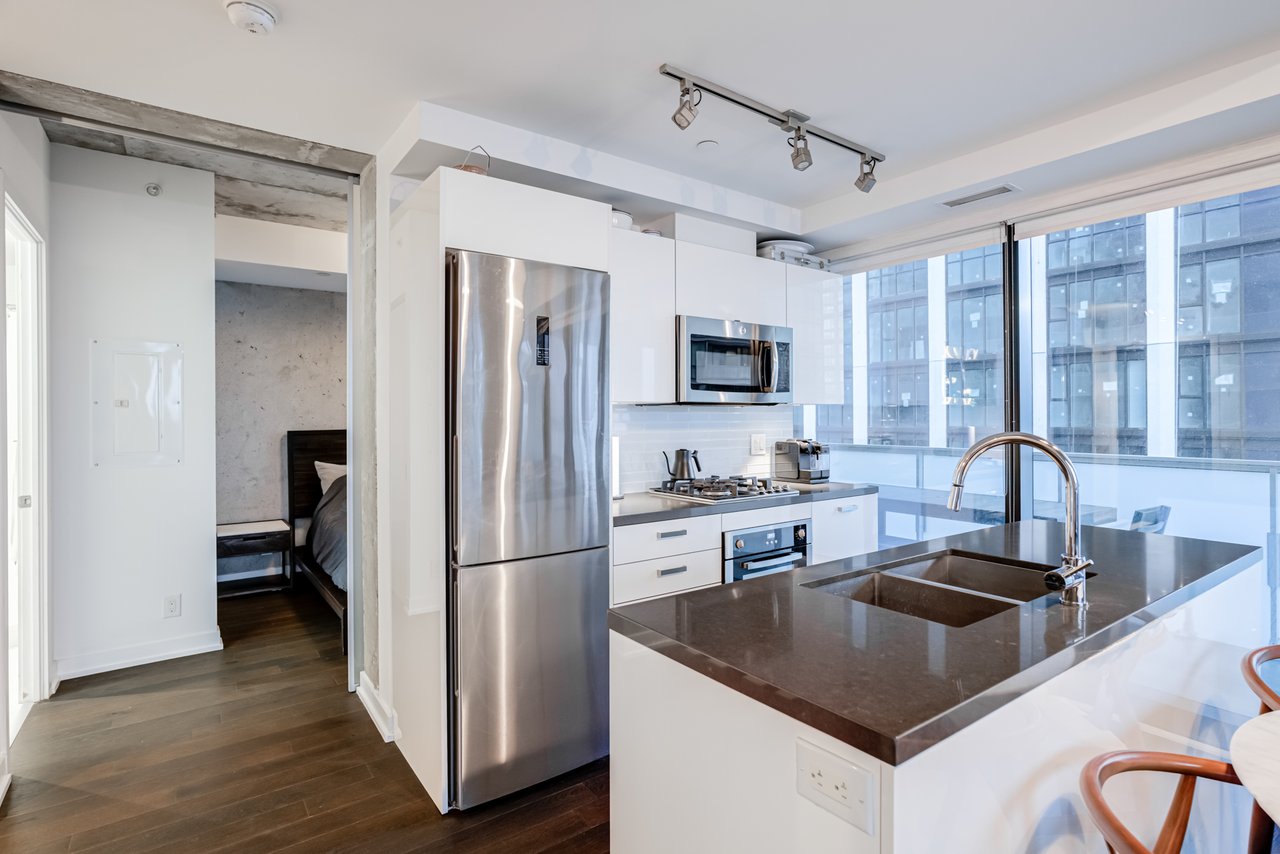 Soft Loft Dreams Are Made Of These! Welcome To The King Charlotte - Located In The Heart Of The Entertainment District. Beautifully Appointed 2 Bedroom, 2 Full Bathroom Suite - Boasting A Highly Sought After Split Floor Plan. Situated On The South West Corner Of The Building Offering An Abundance Of Natural Light With Sweeping Cityscape & Lake Ontario Views! Enjoy Oversized Balcony, Spanning The Length Of The Unit - Outfitted With Gas BBQ. Exposed Concrete Ceilings & Floor To Ceiling Windows Throughout. All Light Fixtures & Window Coverings Included. Primary Bedroom Offers Large Closet & 4pc Ensuite Bathroom. 1 Underground Parking Included. Building Is Rich In Amenities: Rooftop Tanning Deck & Outdoor Pool, State Of The Art Fitness Centre, 24hr Concierge, Party Room & Much More.