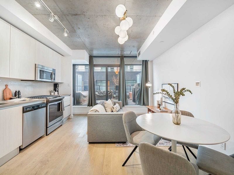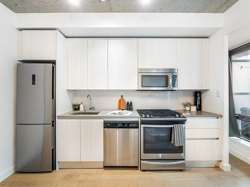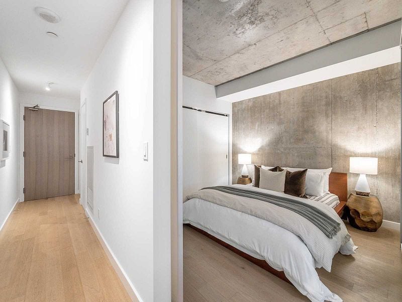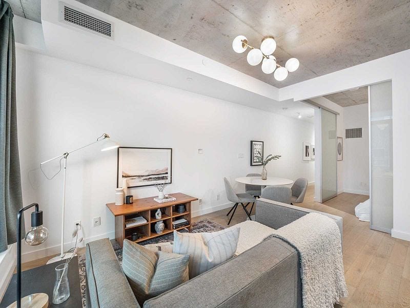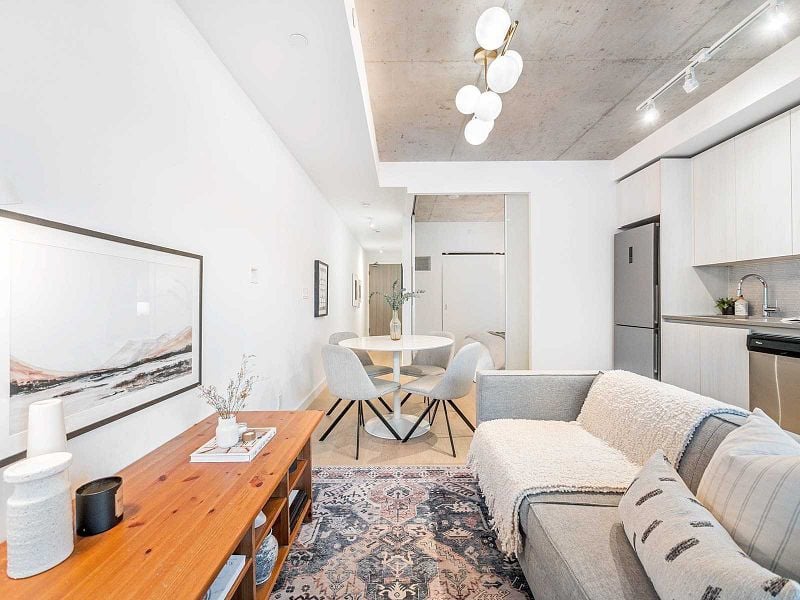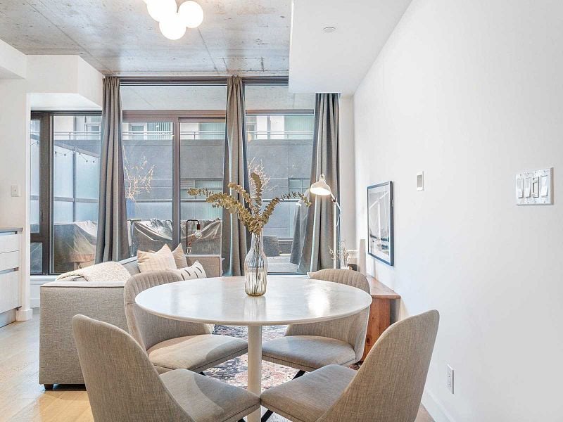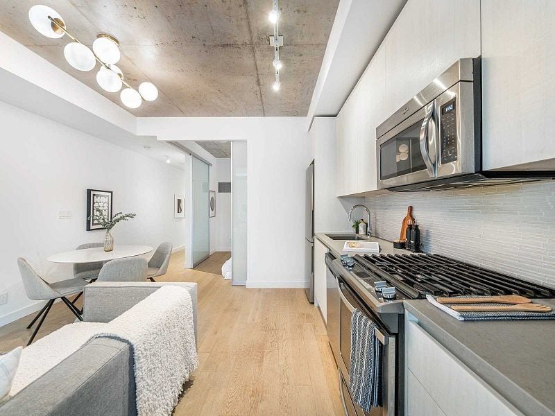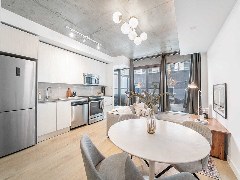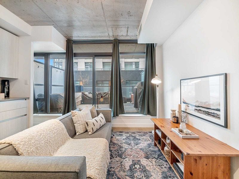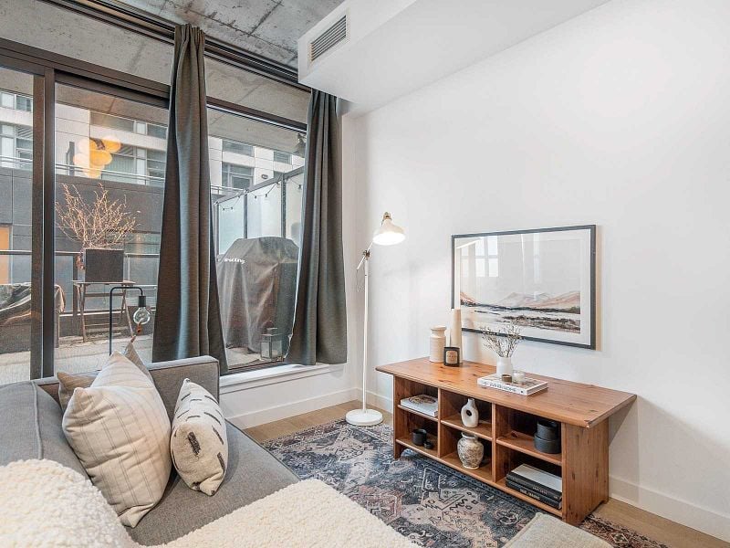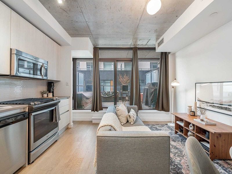 Welcome to SUITE 608 at One Eleven. This intelligent layout gives you the perfect flow of Space and Exudes a Feeling of comfort and ease. 9ft ceilings. Modern finishes in the kitchen include a Gas stove when cooking to impress, a microwave hood vent for those quick meals after a day out in the neighbourhood and a dishwasher for easy clean up! The terrace literally doubles the Living/Dining space in the warmer months. Not many can boast outside space this suite delivers. Those summer nights will come again soon! Get in and settled in time to enjoy!
