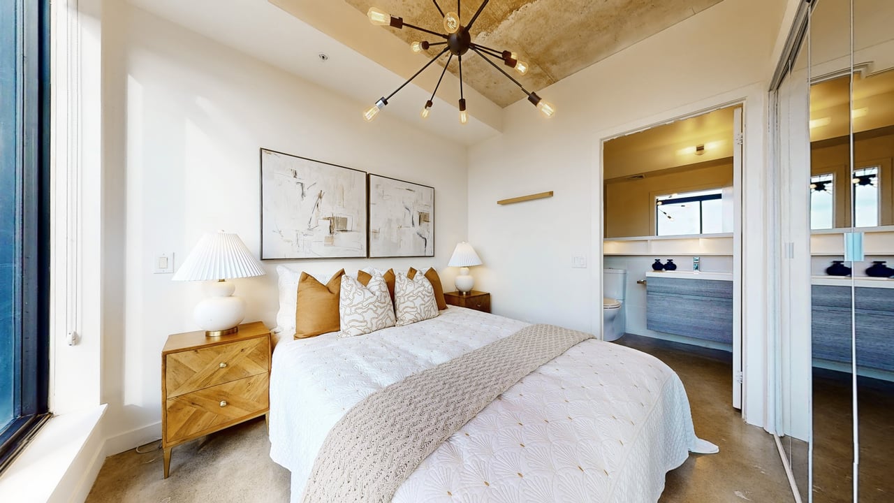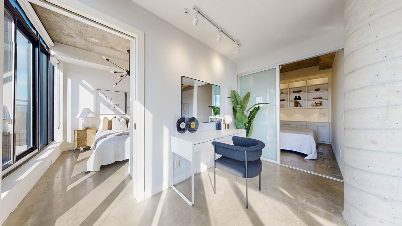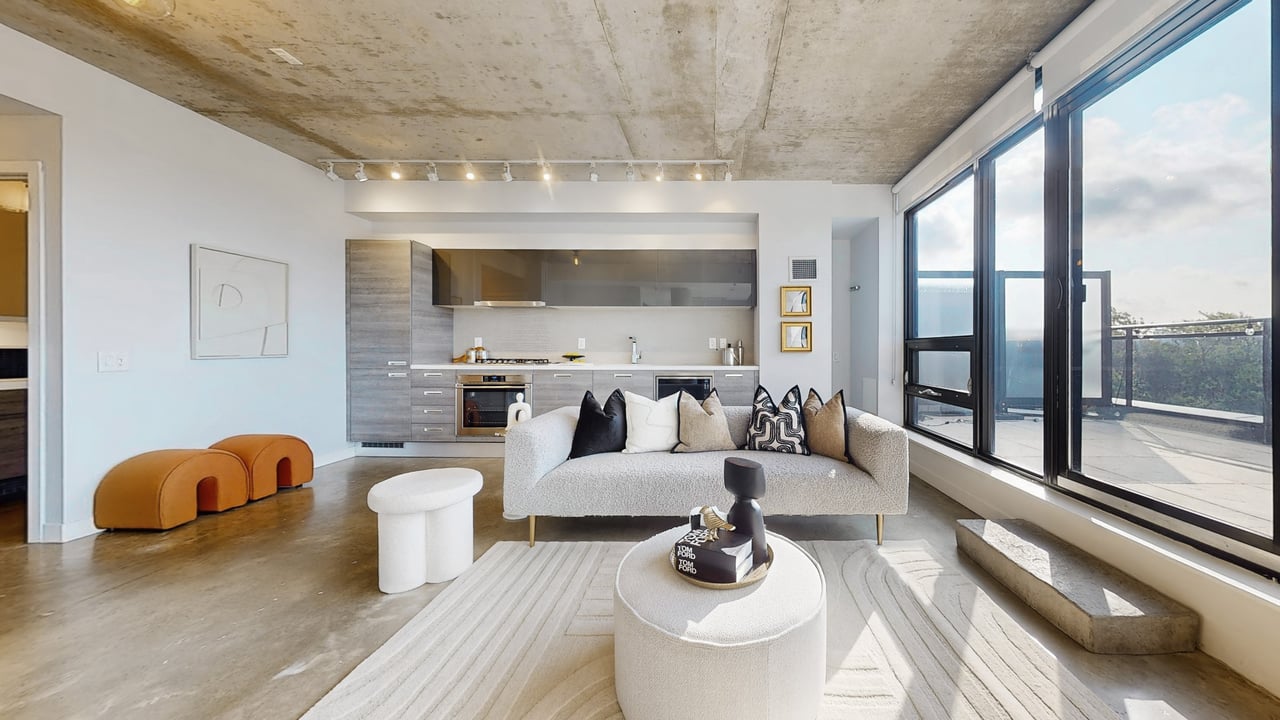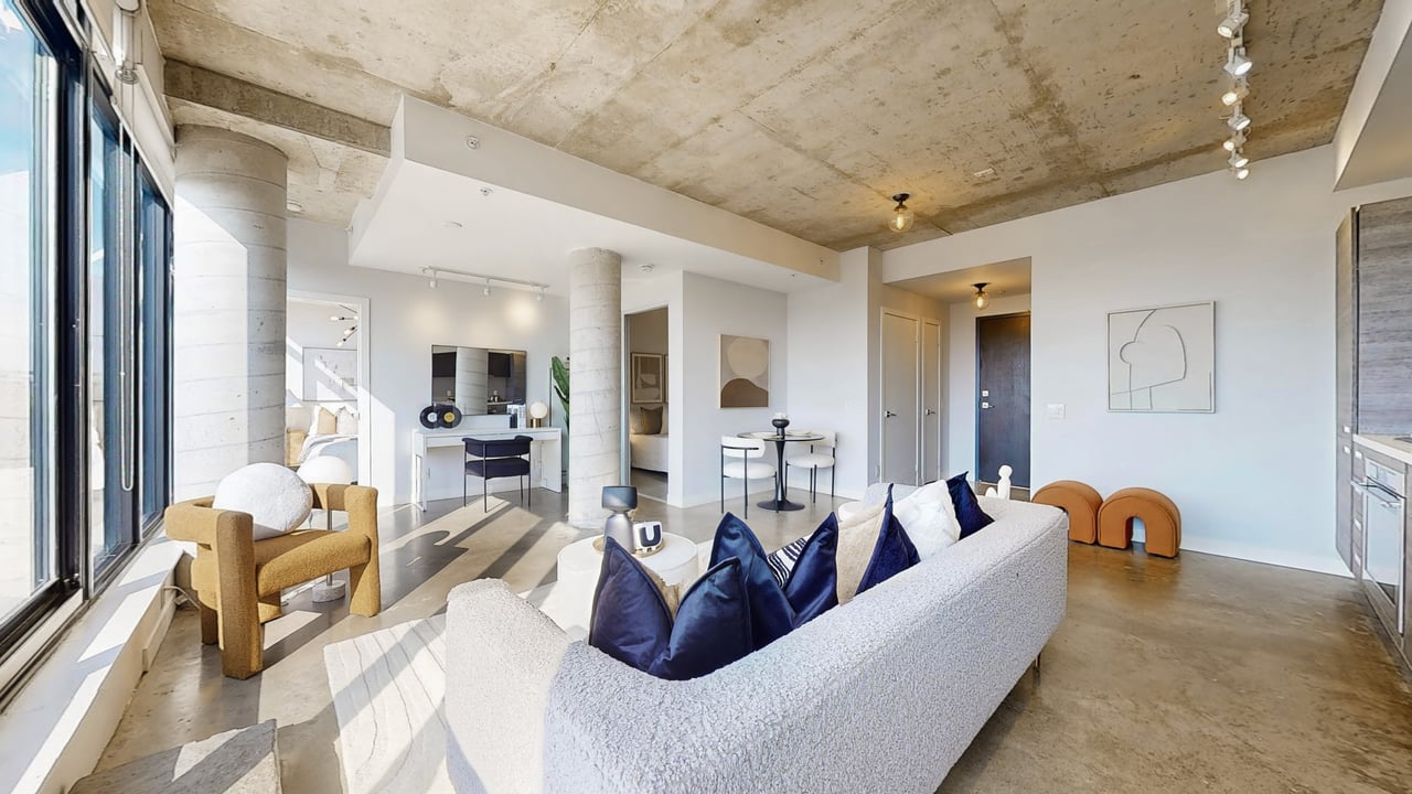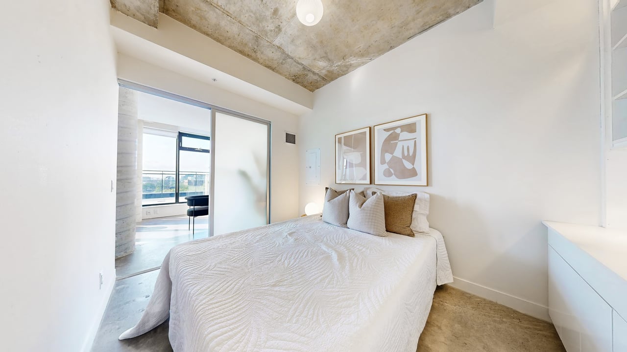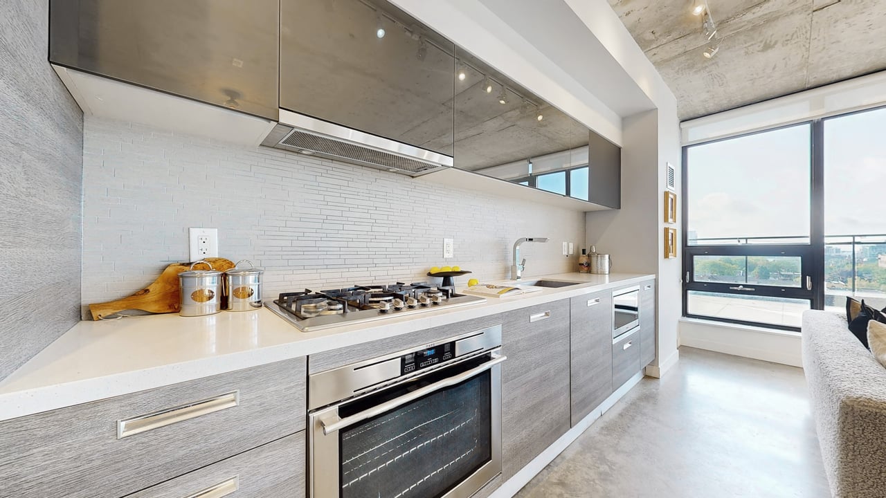 Rarely Offered The Exquisite Abacus Loft! 2 + Den with Stacked Parking and Locker. This stunning loft features a spacious living and entertaining area, soaring 9-ft ceilings, polished concrete floors, and an impressive 300+ SF terrace with southern exposure offering unobstructed views of the city skyline and CN Tower. Sun-drenched floor-to-ceiling windows fill the home with natural light all year round. Located in the heart of Trinity Bellwoods / Ossington, you'll enjoy top-notch restaurants, shops, and venues, all within walking distance yet the building is peacefully tucked away from street noise. The Abacus is a well-managed mid-rise building with strong reserve funds, making it an ideal opportunity for both end-users and investors.