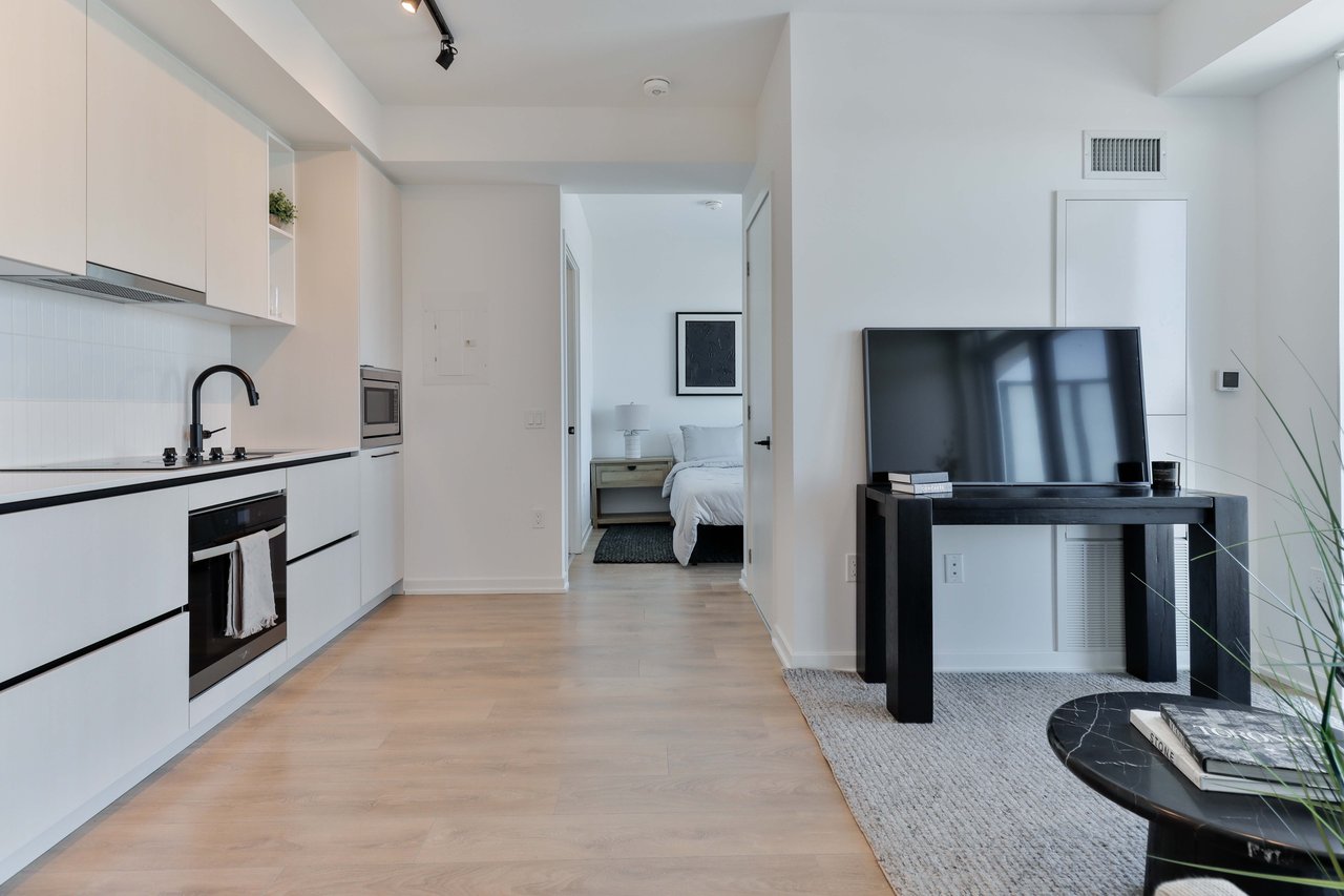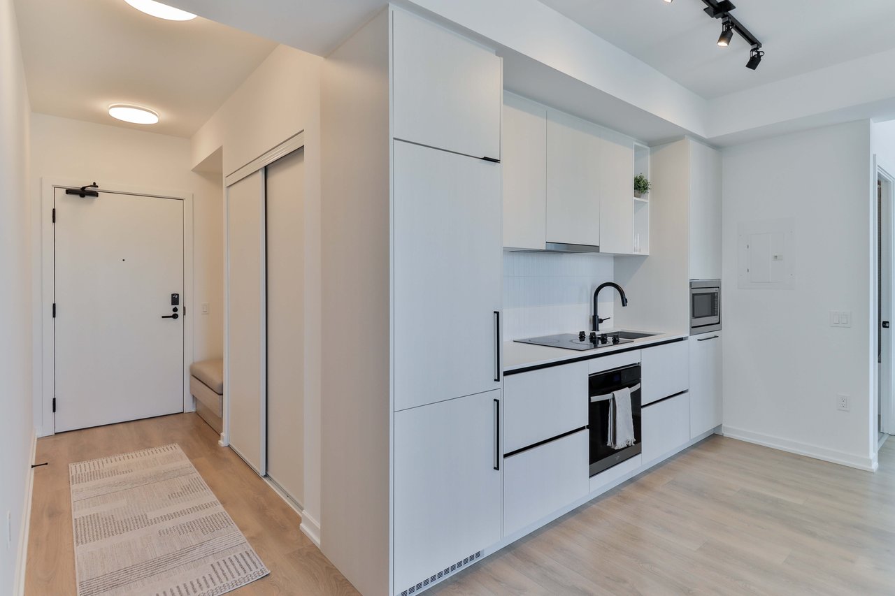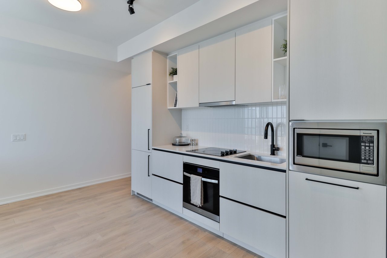 Welcome to this beautifully designed studio suite! Offering 493 sq. ft. of thoughtfully planned interior space plus a 117 sq. ft. north-facing balcony, this suite can easily be converted into a one (01) bed. Combines functionality with elevated modern design. Enjoy floor-to-ceiling windows, wide-plank laminate flooring throughout, and a sleek contemporary kitchen featuring integrated, panelled appliances. Residents have access to over 22,000 sq.ft. of world-class amenities, including a rooftop pool, 24-hour concierge, state-of-the-art fitness centre, kids' playroom,