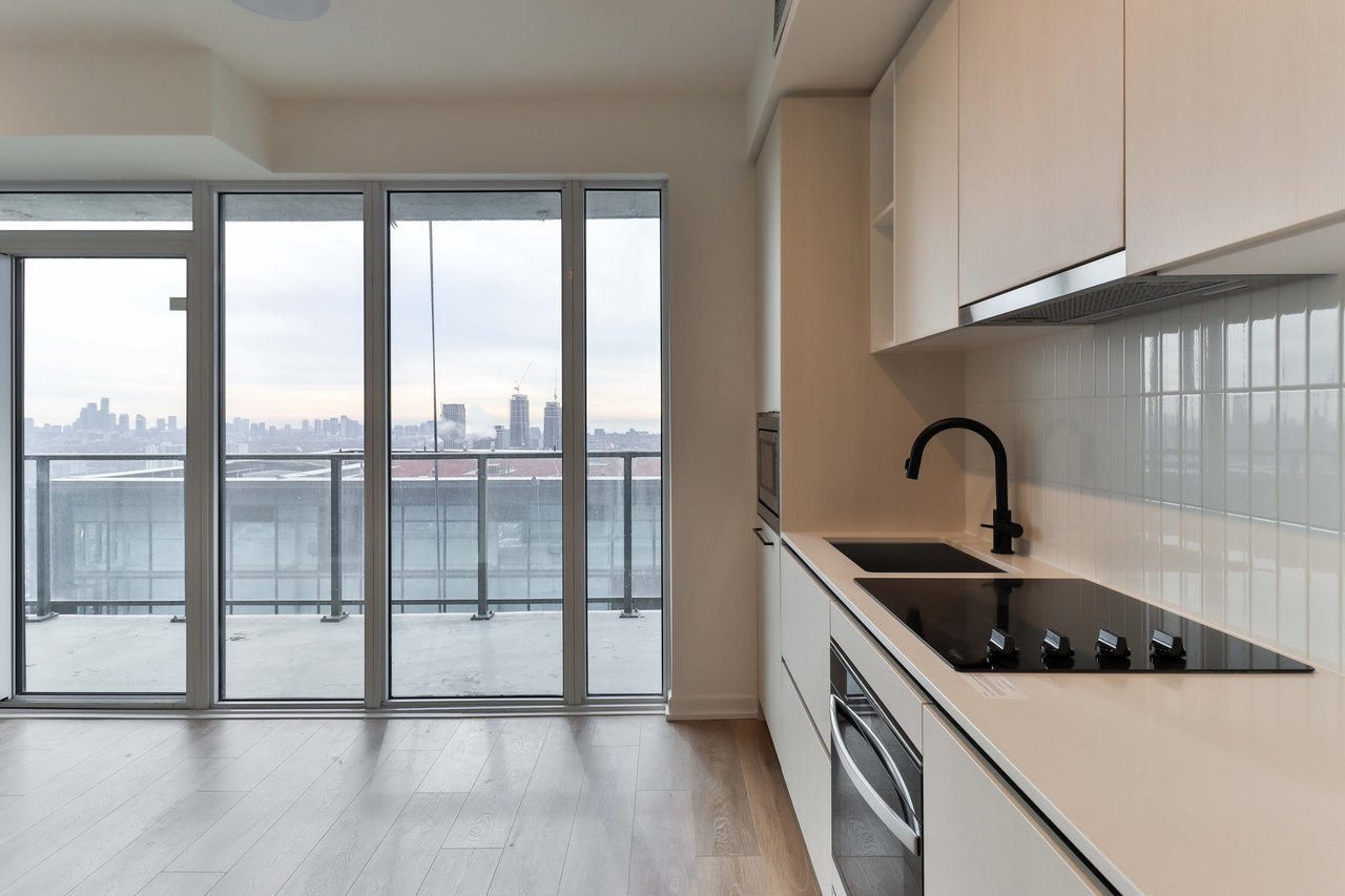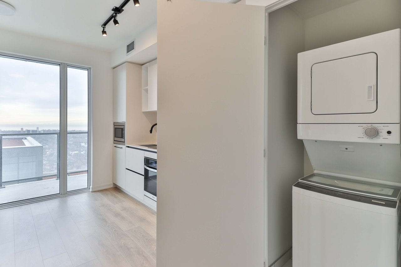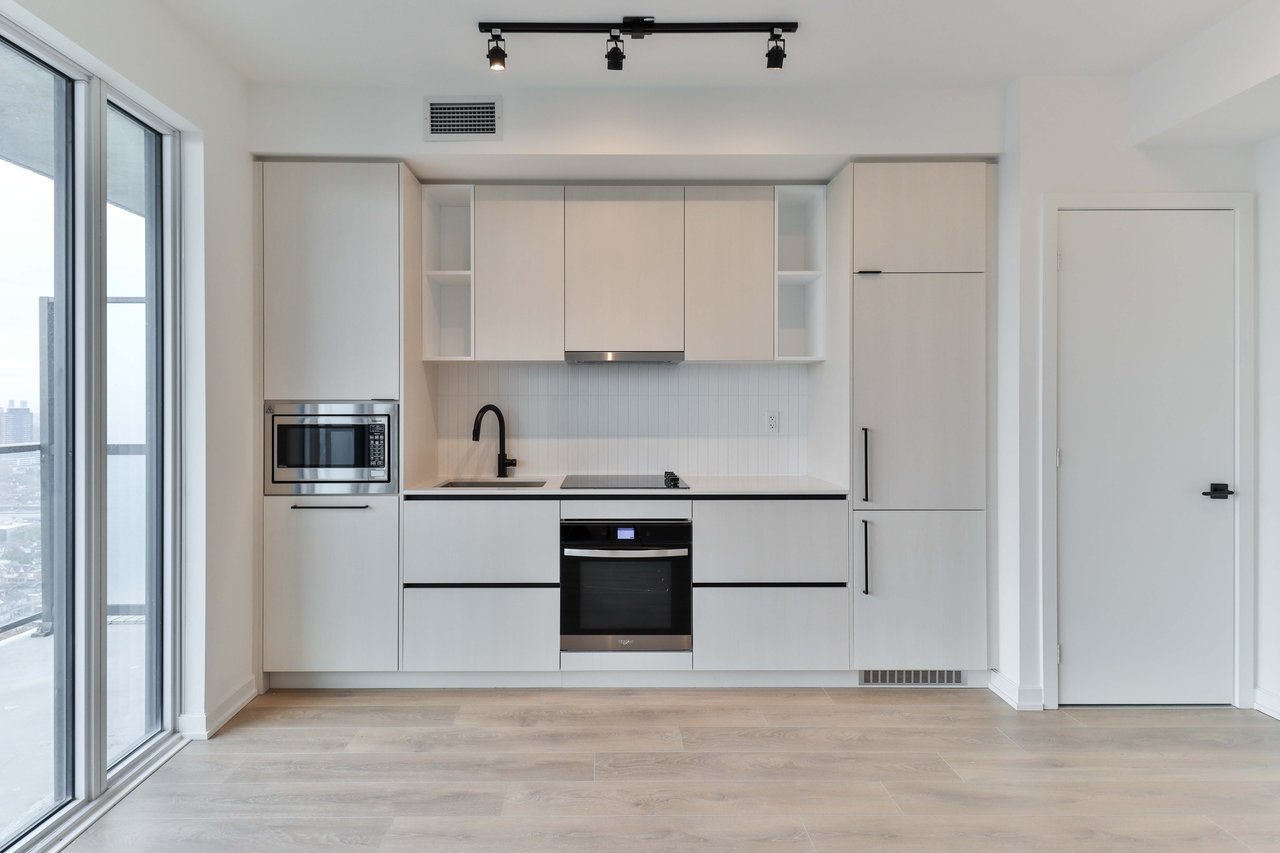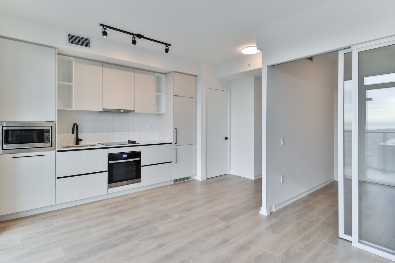 Be the first to live in this brand-new, never-lived-in 1-bedroom, 1-bathroom suite, and features modern finishes, a spacious private 106sq/ft balcony, floor-to-ceiling windows that fill the space with natural light, and sleek laminate flooring throughout. The kitchen comes equipped with built-in appliances including a fridge, stove, oven, microwave, and dishwasher, along with in-suite laundry. Ideally located just steps from shops,