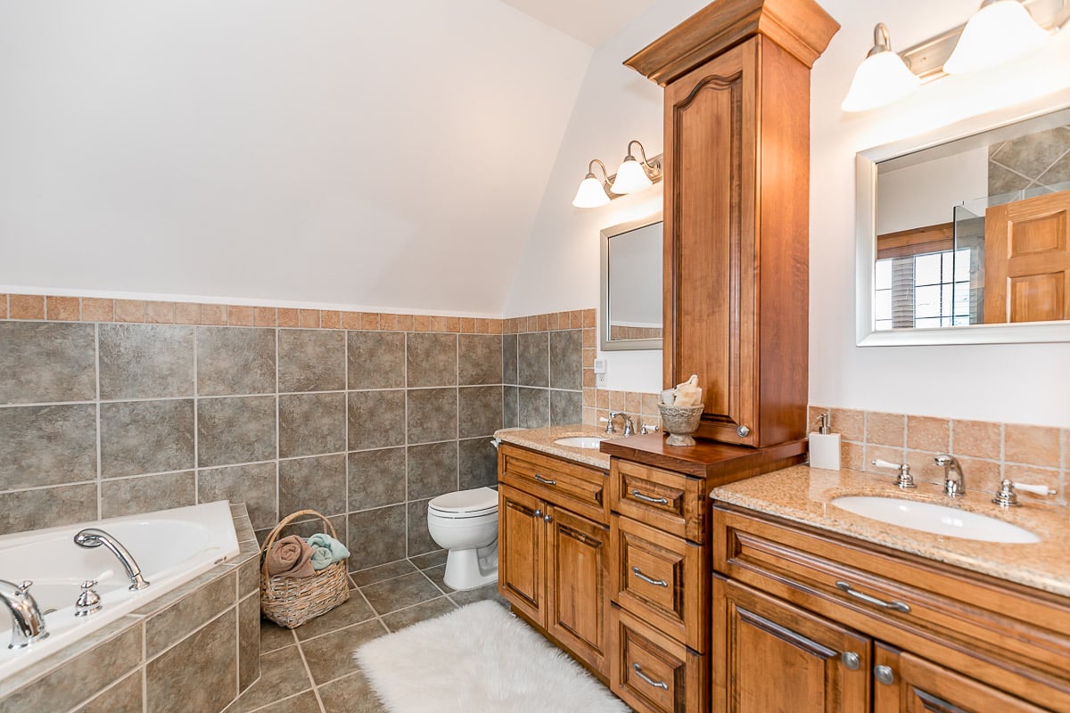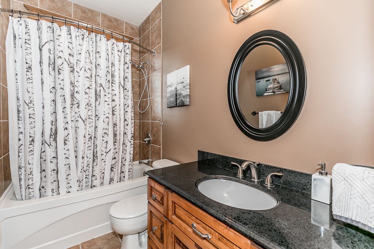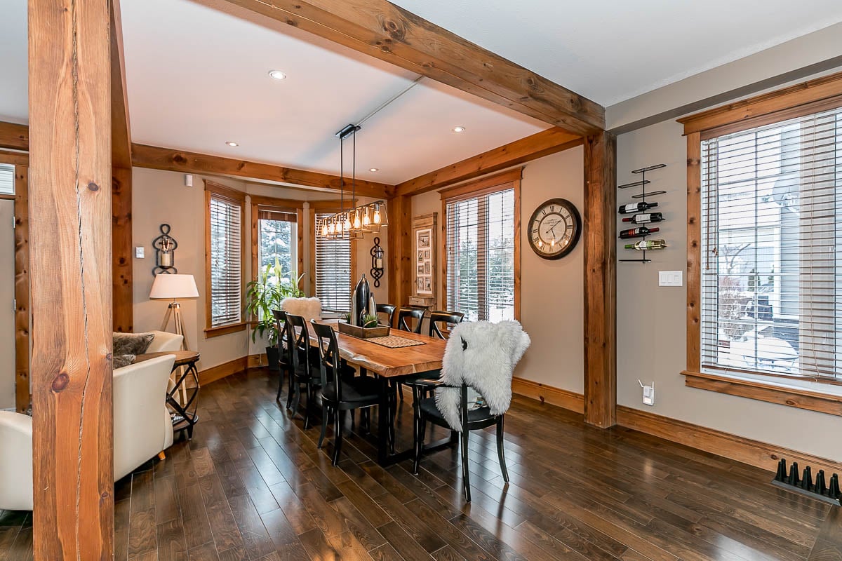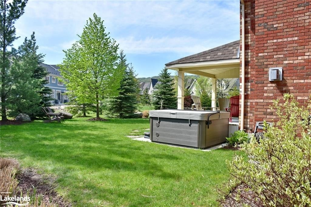 gourmet kitchen offering granite counters, breakfast bar & plenty of storage. Extra large dining area for entertaining & cozy sitting room with stone gas fireplace, walk out to deck & hot tub, relax after a hard day on the hills! Up the stairs is an oversized family room with a 2nd gas fireplace. Upper level also includes 3 beds, main bath, master with generous ensuite & large walk in. Hardwood & stone flooring throughout. In the Summer & Spring enjoy your professionally landscaped yard with mature trees offering privacy, interlocking path up to quaint front porch. Basement is your bonus space with 2 more bedrooms, den and bathroom (perfect for teens!) Also ample parking and 1+ car garage with separate entrance. Contact for list of upgrades. Community pool! This home is a must see!