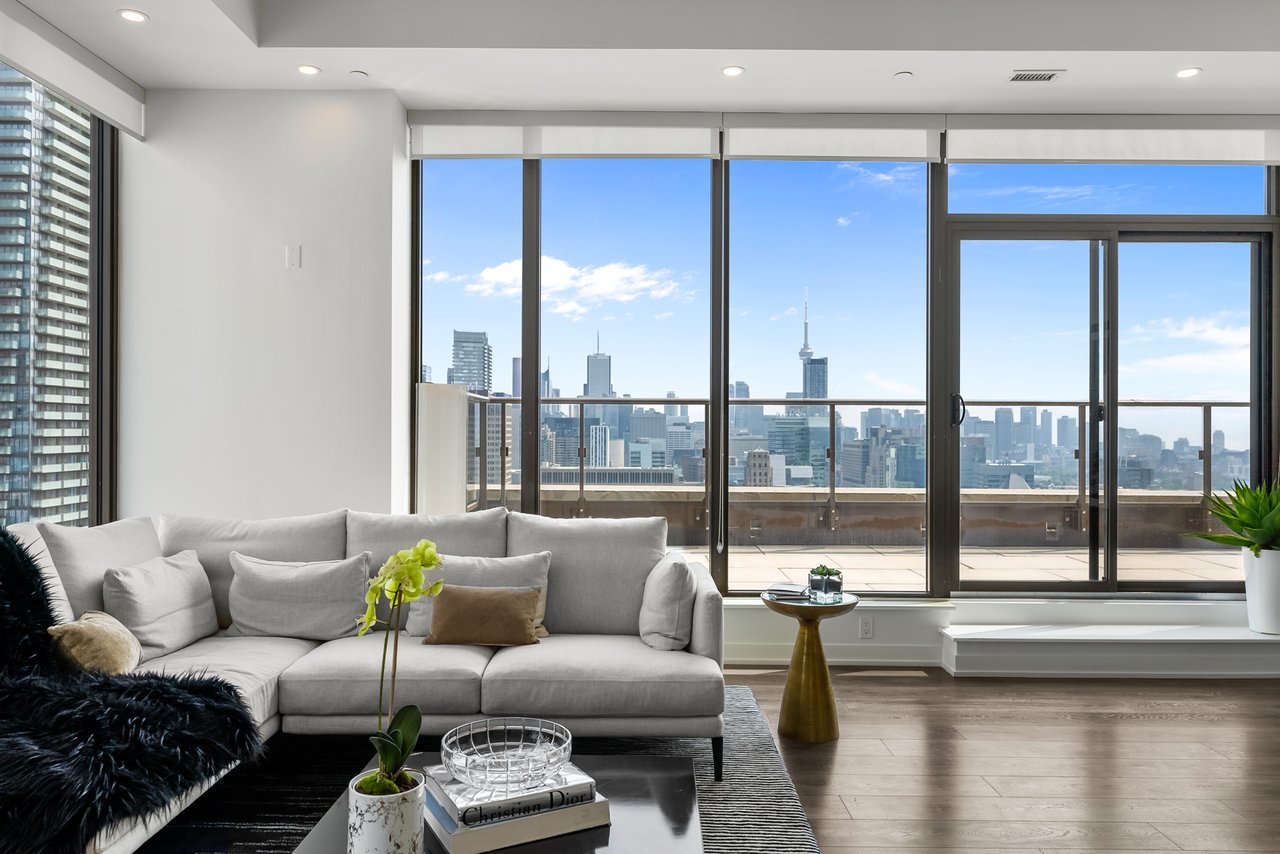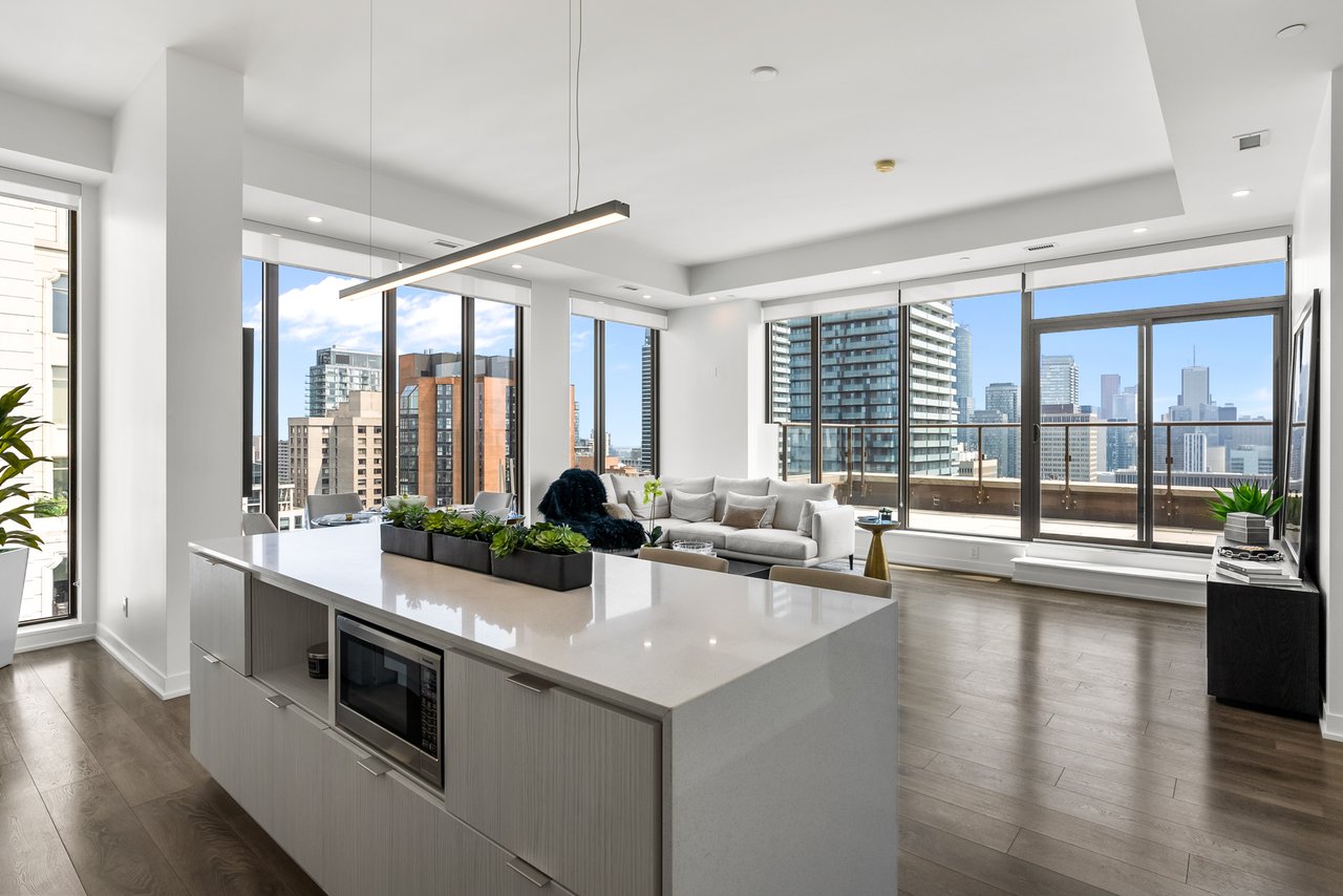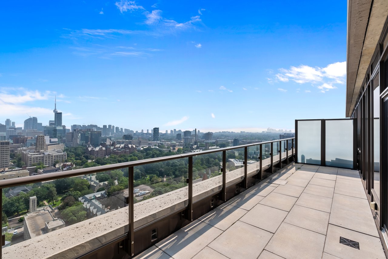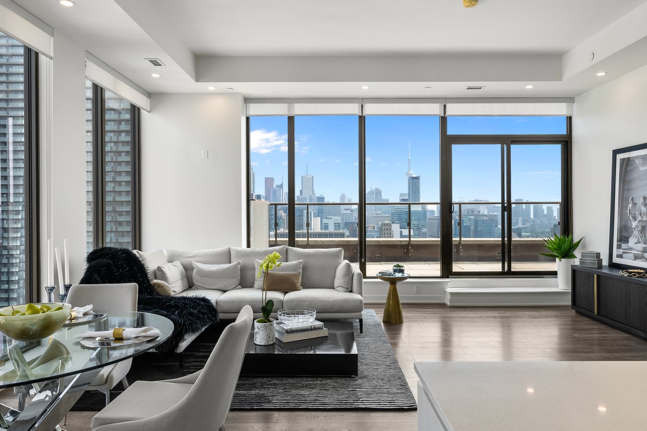 Welcome to Two St. Thomas, where luxury living meets exceptional service, just steps from Yorkville. This impressive penthouse corner suite offers a spacious split-bedroom layout with 2 bedrooms, 2 bathrooms, a den, and 1,245 sq. ft. of interior space. Soaring 11-foot ceilings enhance the open feel of the kitchen, dining, and living areas, while expansive floor-to-ceiling windows fill the home with natural light. Thoughtfully designed for indoor-outdoor living, the suite features a 250 sq. ft. south-east facing terrace, ideal for hosting or unwinding with scenic views of the Toronto skyline. Residents of Two St. Thomas enjoy world-class amenities, including a full-service concierge, state-of-the-art fitness centre, rooftop terrace with BBQs and lounge areas, party room, and an in-house pet spa. Experience the best of luxury living just steps from Yorkville's finest shops, dining, and lifestyle offerings.