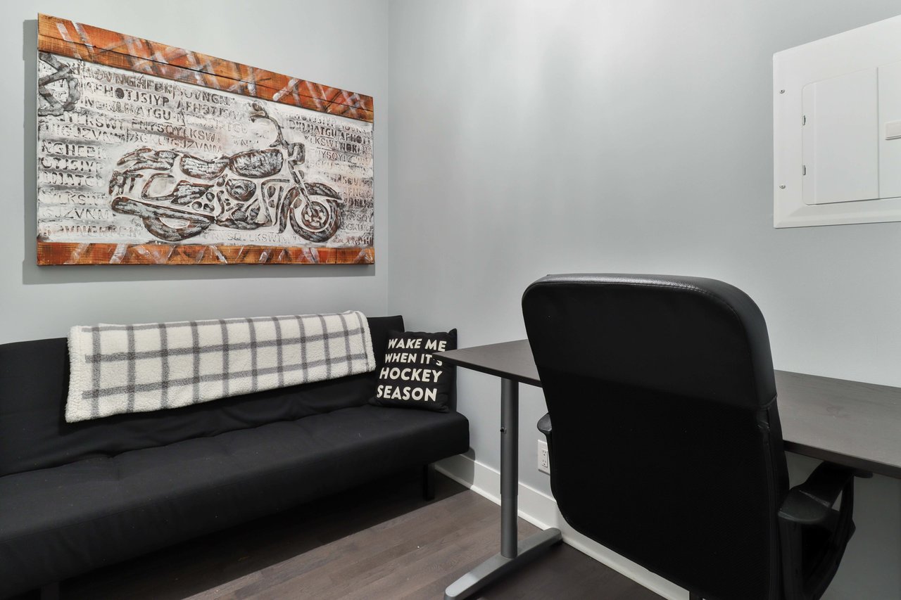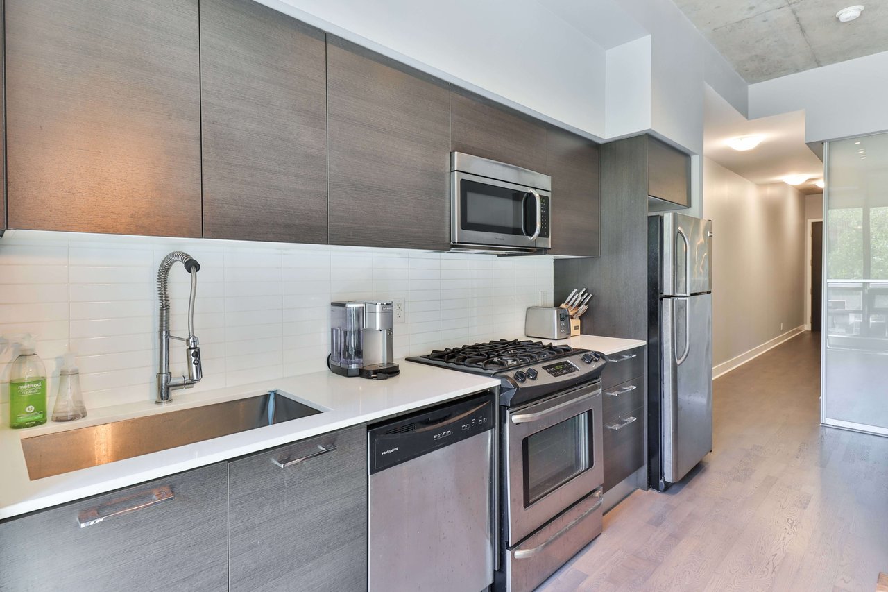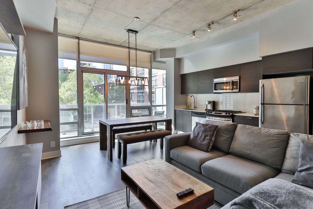 Welcome To 399 Lofts, A Boutique Loft Building W/ Fantastic Amenities Centrally Located Between King West, Queen West, Entertainment District + Financial District! Spacious & Fully FURNISHED South Facing 1 Bed + Den, 1 Bath, 755 Sq Ft + Balcony, Featuring 10 Ft Exposed Concrete Ceilings, Huge Primary Bdrm Closet, Kitchen W/ Gas Stove & Full Sized Stainless Steel Appliances, Bathroom W/ Step-In Glass Shower, Large Open Concept Living/Dining Area, Separate Den, Hardwood Floors Throughout & Large Balcony Overlooking Courtyard. Parking Included! Walk Score 100! Steps To King & Queen West Bars/Restaurants, TTC, Grocery, Financial District, Gardiner Expressway, Rogers Centre, Chinatown, Shops, & More!