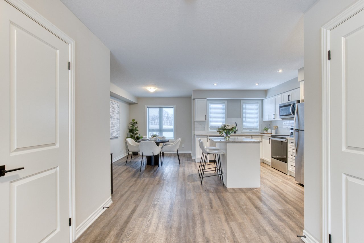 Step Into This Bright And Stylish Home Offering An Open-Concept Layout And A Mostly Carpet-Free Design, With Carpeting Limited To The Stairs. Sun-Filled Rooms Are Enhanced By Large Windows Throughout, Creating An Inviting And Airy Atmosphere. The Heart Of The Home Is The Beautifully Upgraded Kitchen, Featuring Quartz Countertops, Soft-Close Cabinetry, A Timeless Subway Tile Backsplash, And A Large Island Perfect For Entertaining Or Casual Family Meals. A Full Suite Of Stainless Steel Appliances Completes The Space. The Living Room Is Accented With Modern Pot Lights, Adding Both Style And Ambiance. This Home Also Features 3 Generously Sized Bedrooms And 2.5 Bathrooms, Including A Private Primary Ensuite Designed For Comfort And Convenience. Ideally Located Close To Highway 401, Schools, Parks, Scenic Trails, And Shopping, This Home Delivers The Perfect Blend Of Modern Living, Comfort, And Everyday Convenience.