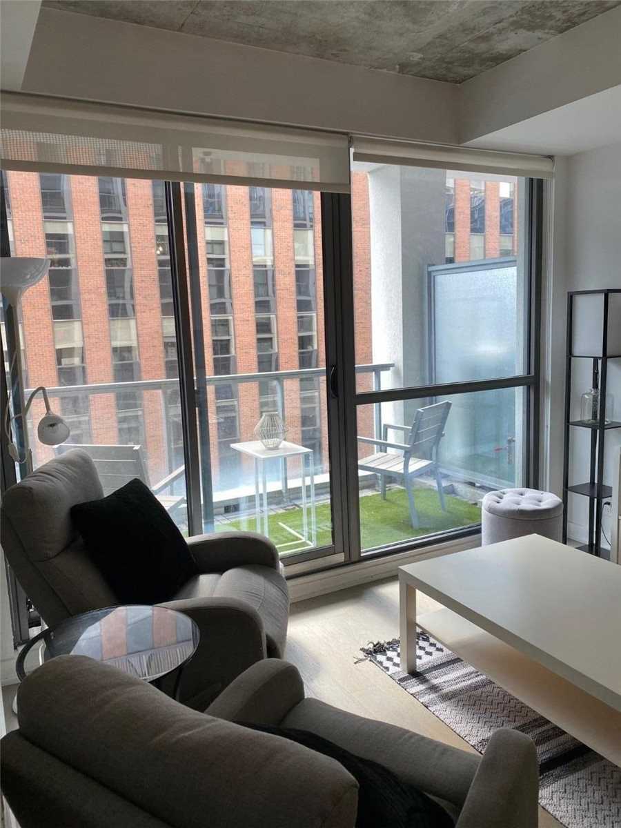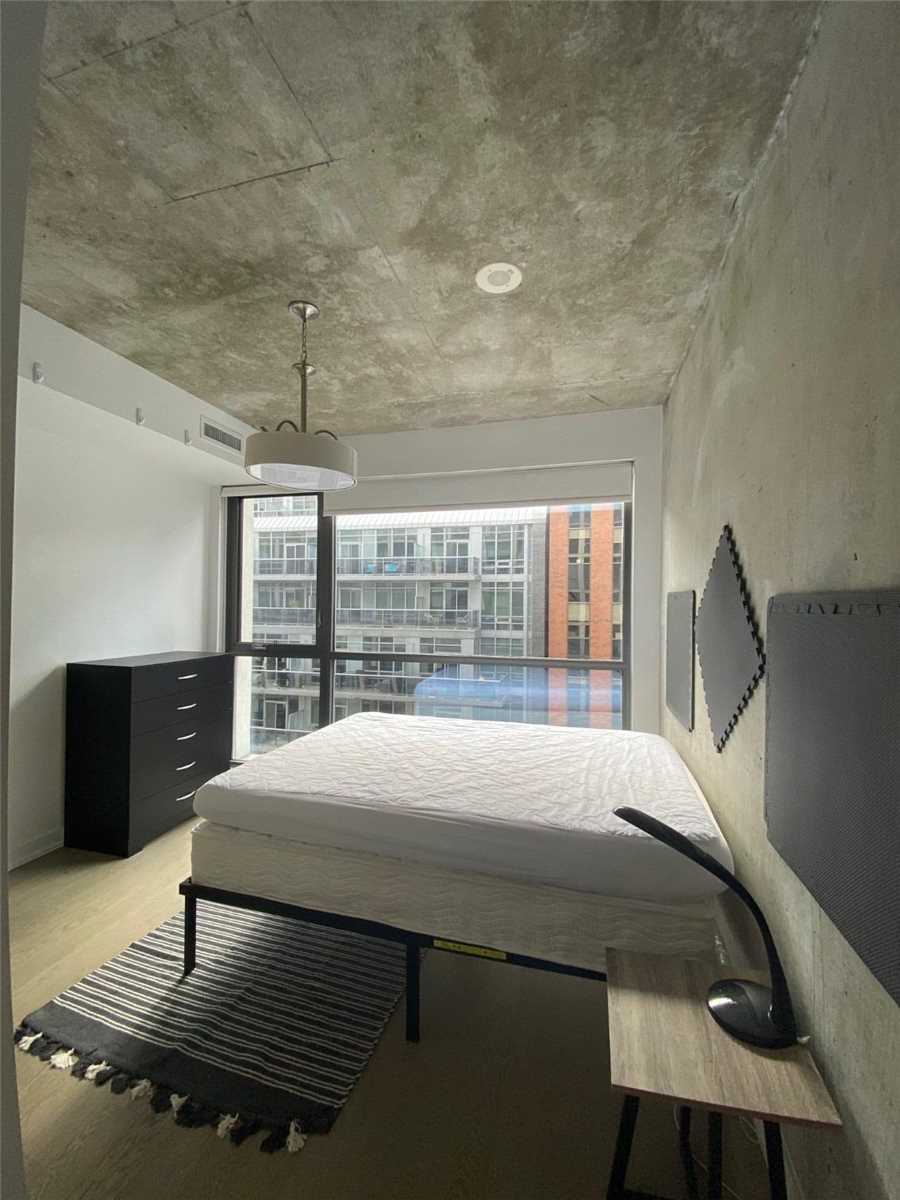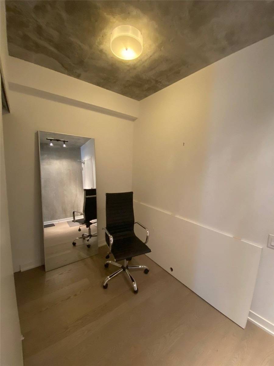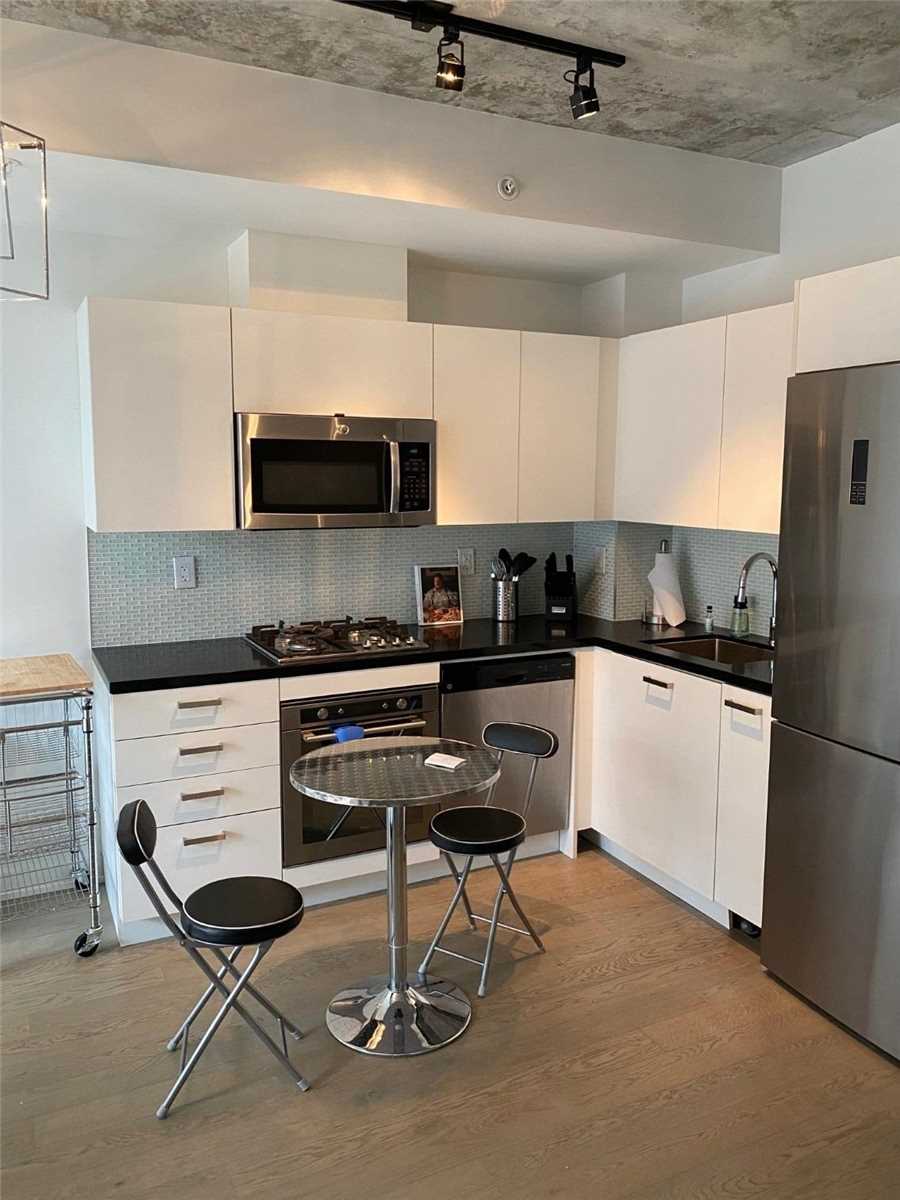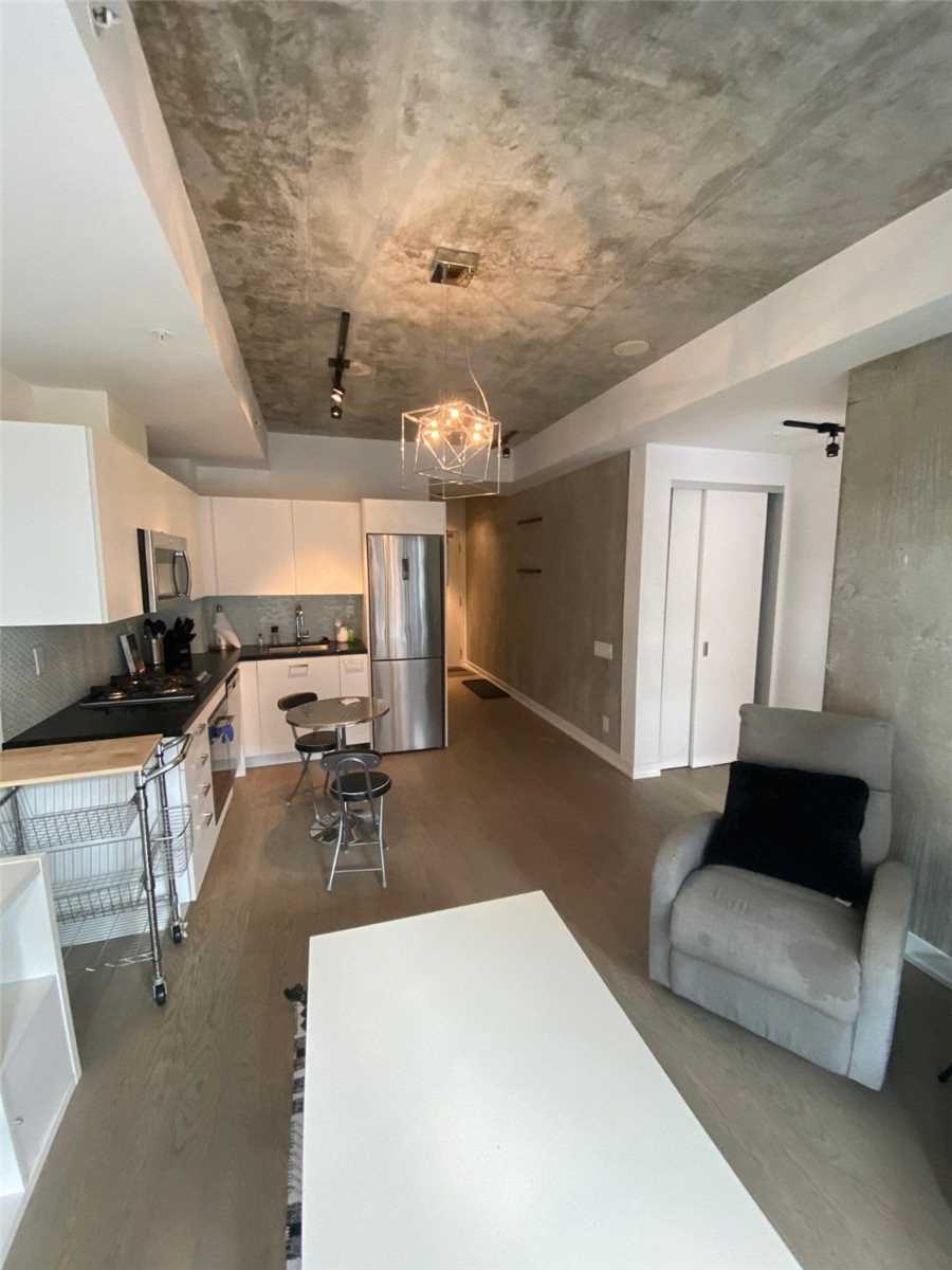 Your Exciting Downtown Life Starts Now! This 1-Bedroom + Den suite w/ locker is designed to impress with its sleek finishes, exposed concrete ceilings, and hardwood floors throughout. The open-concept living area is filled with natural light from floor-to-ceiling windows and offers a walkout to a spacious balcony. The custom kitchen boasts a gas range, quartz countertops, and stainless steel appliances. Enjoy a generous bedroom, ample storage, and the convenience of ensuite laundry. Building amenities include a 24-hour concierge, fully equipped gym, stylish party room, and more. Perfectly located between King and Queen West, you're steps from top restaurants, shopping, and city conveniences. Don't Miss Out - Book A Showing Today!