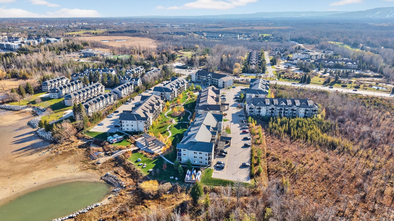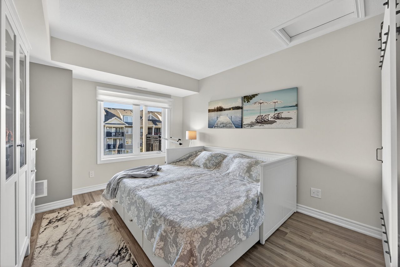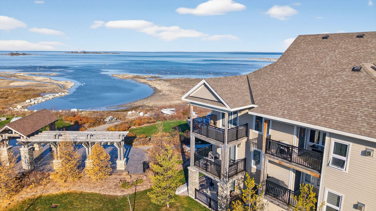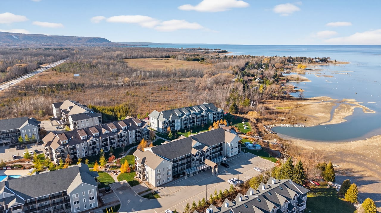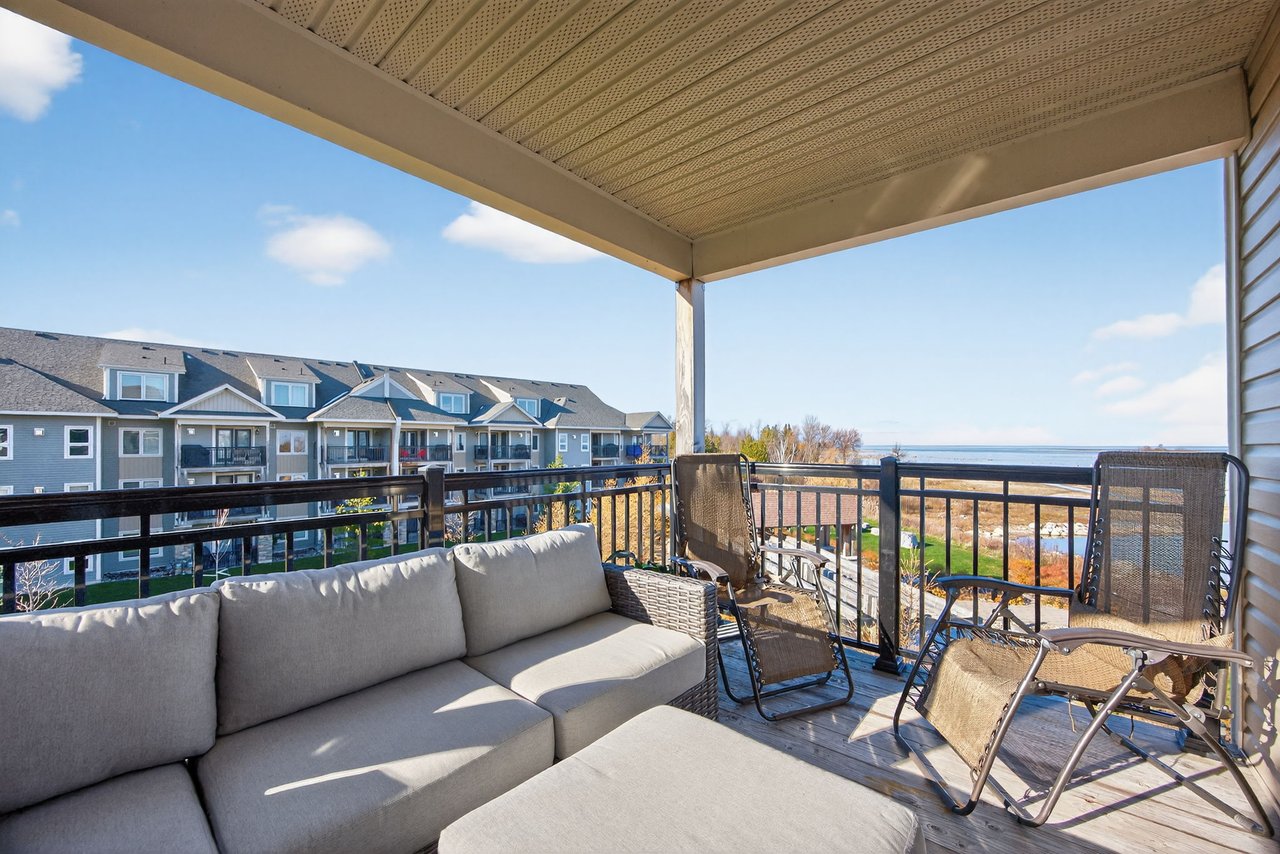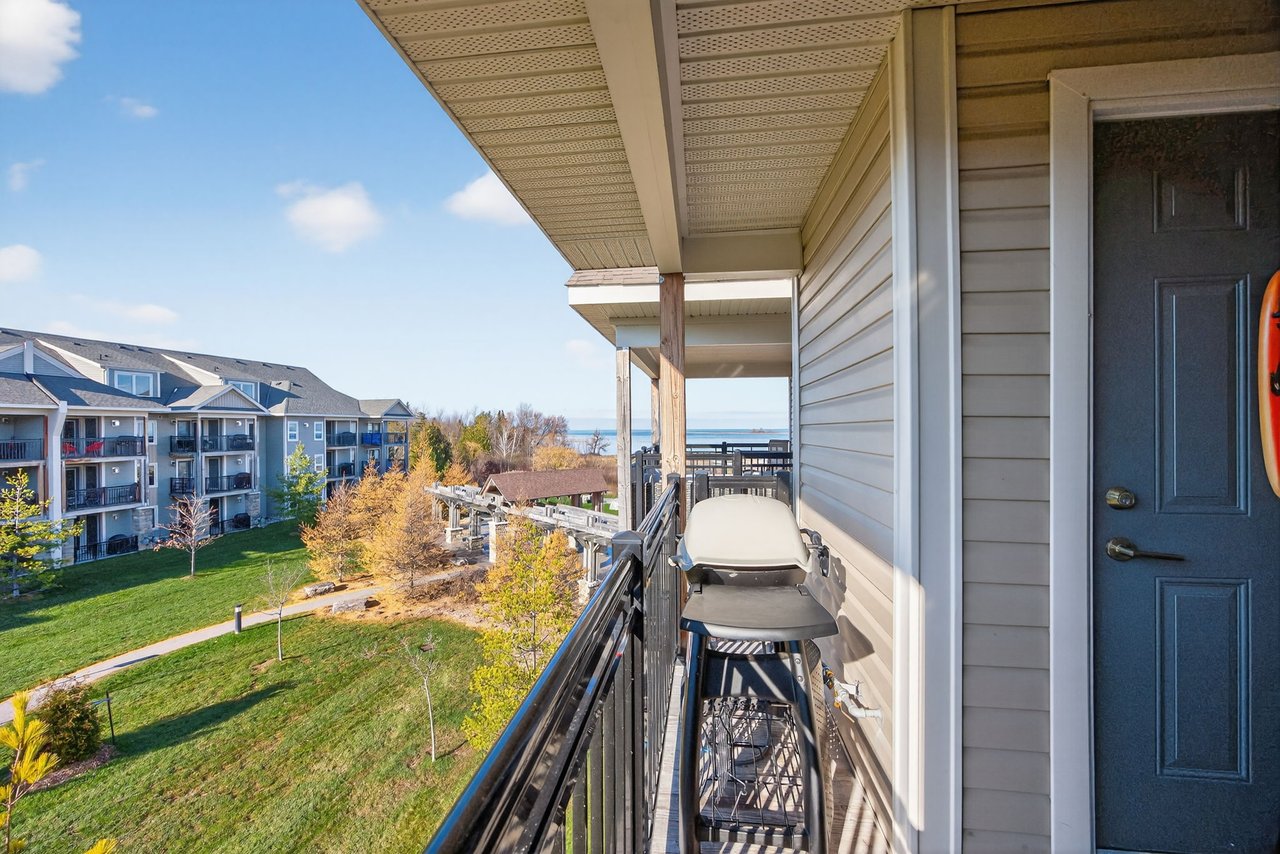 Welcome To The Most Sought-After Waterfront Condo Residence In Wyldewood Cove, Collingwood. This Rare Offering Overlooks The Shores Of Georgian Bay With Unobstructed Water Views. Spanning Over 1,300 Sqft Of Functional Living Space, This Upgraded 3-Bedroom, 2.5-Bath Suite Also Includes 150 Sqft Of Outdoor Space Across Two Balconies, Perfect For Enjoying Panoramic Views Of The Nottawasaga Lighthouse Set Against The Shimmering Waters Or The Glowing Blue Mountain Lights By Night. Inside, Thoughtful Upgrades Elevate The Suite, From The Beautiful Stone Gas Fireplace To California Closets Throughout, Custom Built-In Closets, Pot Lighting, Elegant Window Coverings, And A Glass Walk-In Shower In The Primary Suite. The Kitchen Features Full-Size Stainless Steel Appliances, An Oversized Breakfast Bar, And Granite Counters. The Second Full Bathroom Offers A Double Vanity, Perfect For Families, Guests, And Day-To-Day Living. Wyldewood Is A Well-Managed, Four-Season Community Offering A Quiet, Boutique Lifestyle With Access To A Year-Round Outdoor Pool, Gym, And Pristinely Maintained Grounds That Complement The Natural Landscape And Waterfront Setting. Situated Just Minutes Away From Blue Mountain Resort, Alpine Ski Club, Craigleith Ski Club, Scandinavian Spa, Golf Courses, Country Clubs, Beaches, And The Charming Shops And Restaurants Of Downtown Collingwood. This Is The Ideal Home For Both Relaxation And Recreation. Experience The Very Best Of Collingwood Living, Where Comfort, The True Canadian Lifestyle, And Breathtaking Views Come Together Perfectly.