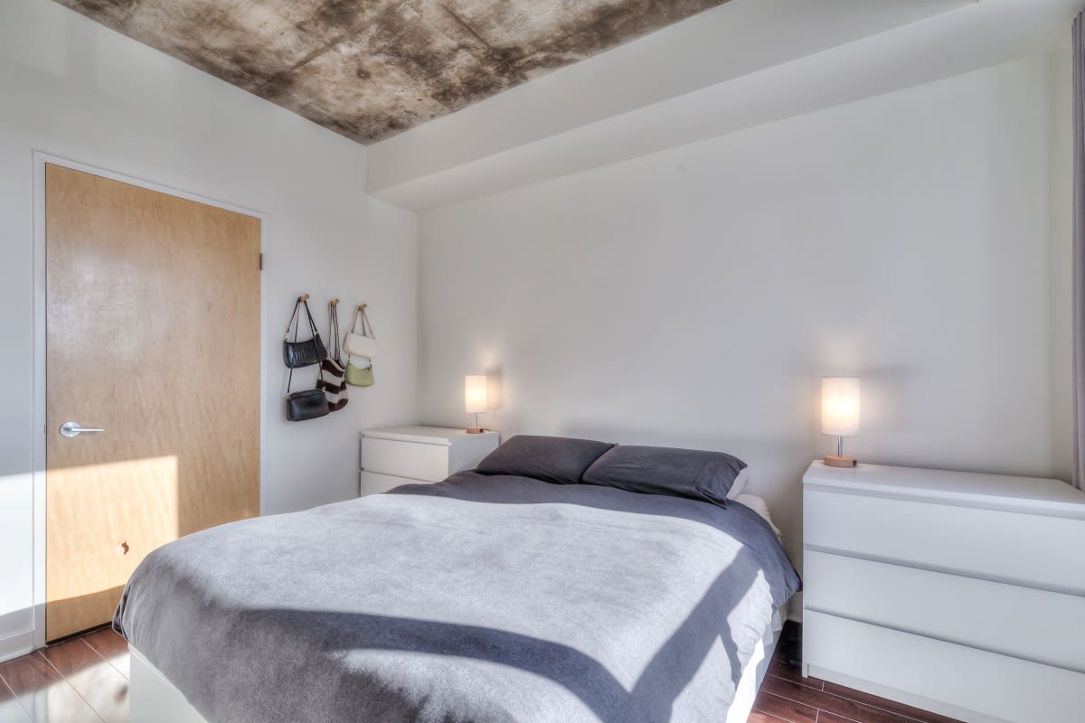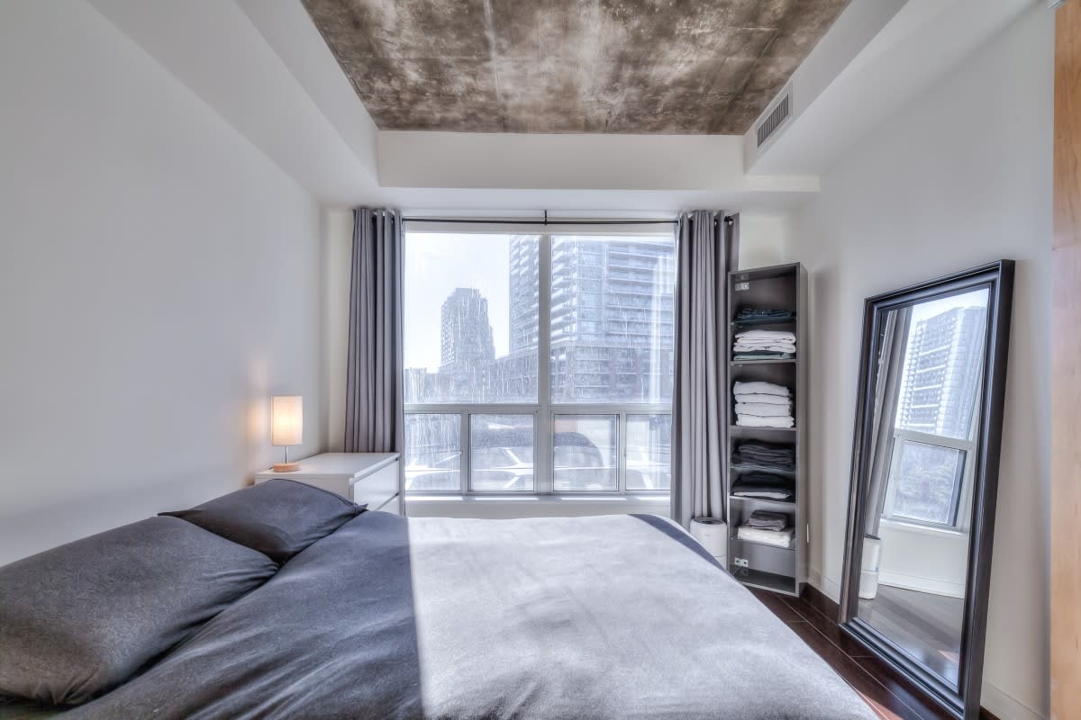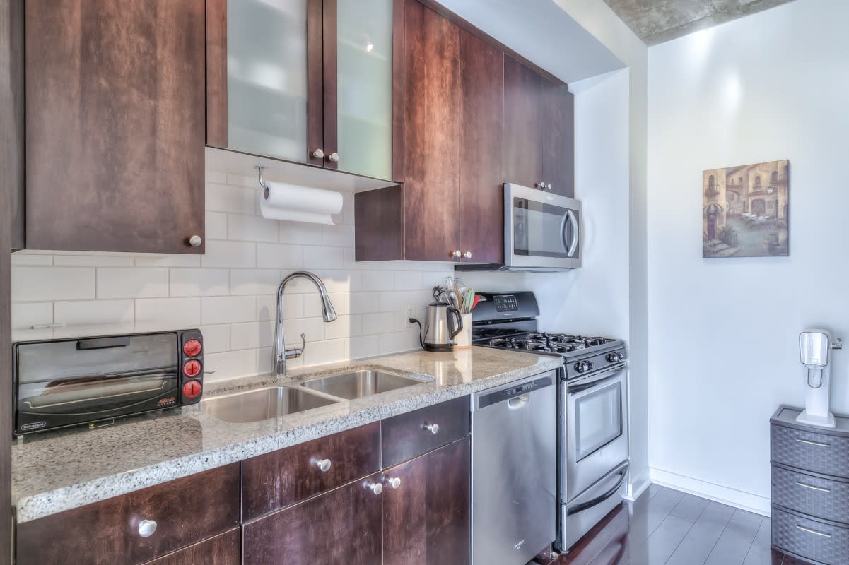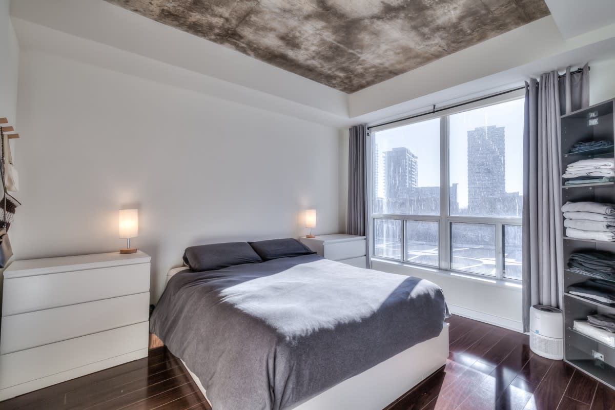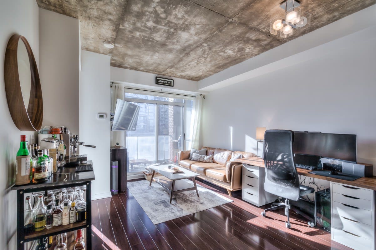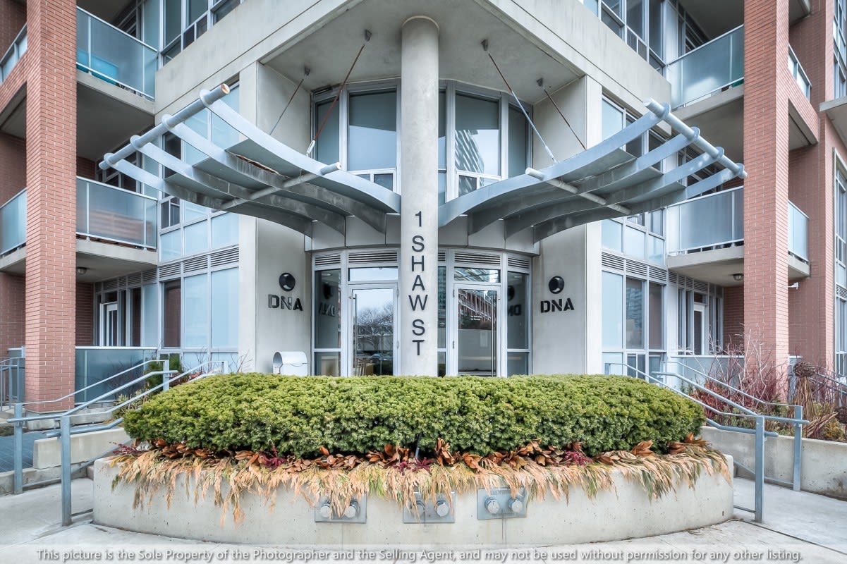 Very large, well laid out south facing 1 bedroom at DNA lofts. Features high exposed concrete ceilings, large kitchen with gas cook top, lots of storage & centre island; large bedroom with walk-in closet and modern bathroom with tons of counter space and good sized balcony. The building amenities include a gym, rooftop deck, party room and visitor parking. Perfectly located within a 5 min walk from the shops of Liberty Village, Queen West, King West & Ossington St. TTC at front door with Starbucks next to the lobby and grocery store across the street. Includes parking.
