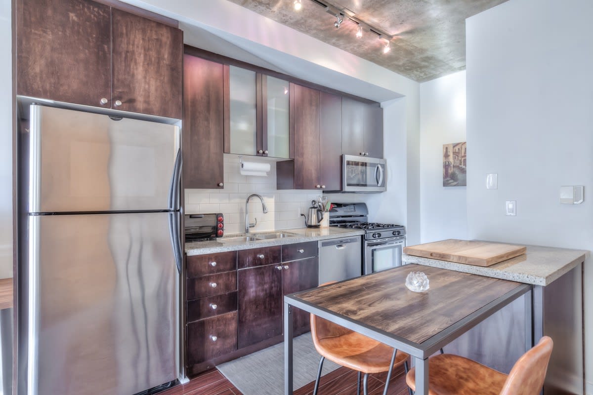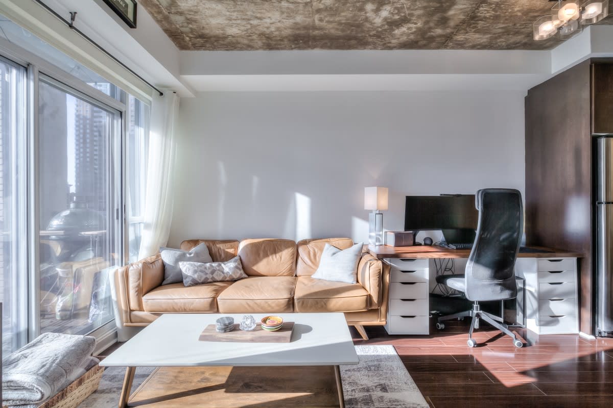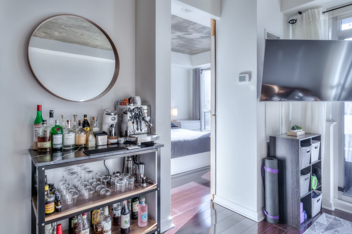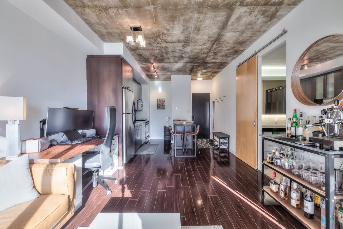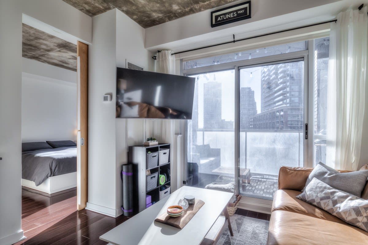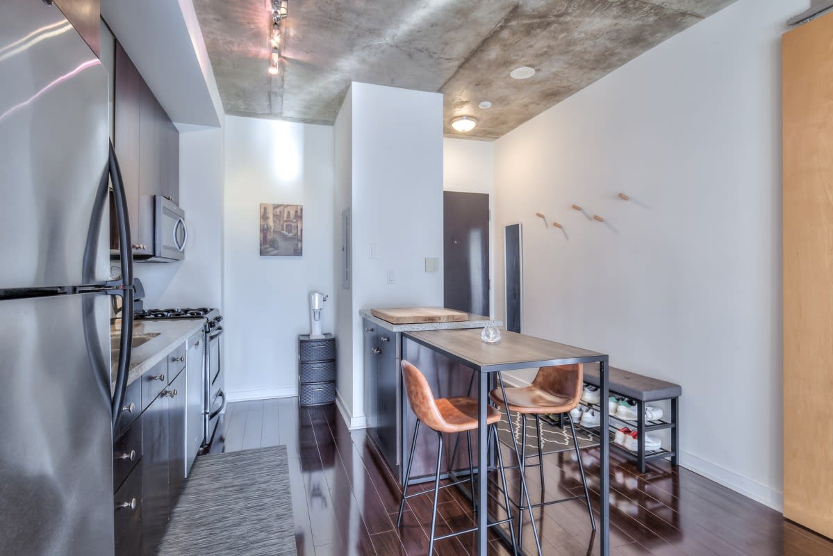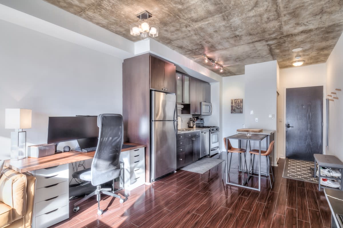 Very large, well laid out south facing 1 bedroom at DNA lofts. Features high exposed concrete ceilings, large kitchen with gas cook top, lots of storage & centre island; large bedroom with walk-in closet and modern bathroom with tons of counter space and good sized balcony. The building amenities include a gym, rooftop deck, party room and visitor parking. Perfectly located within a 5 min walk from the shops of Liberty Village, Queen West, King West & Ossington St. TTC at front door with Starbucks next to the lobby and grocery store across the street. Includes parking.