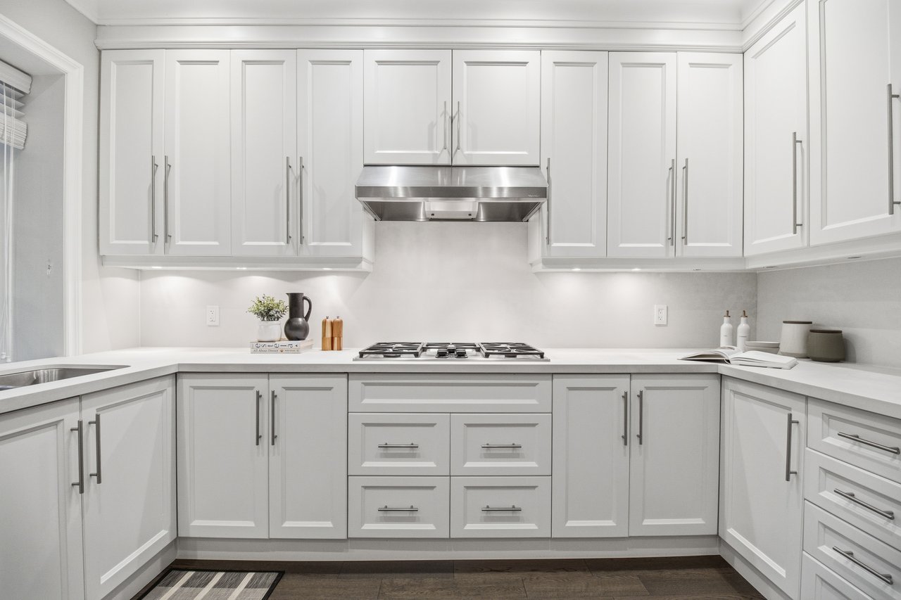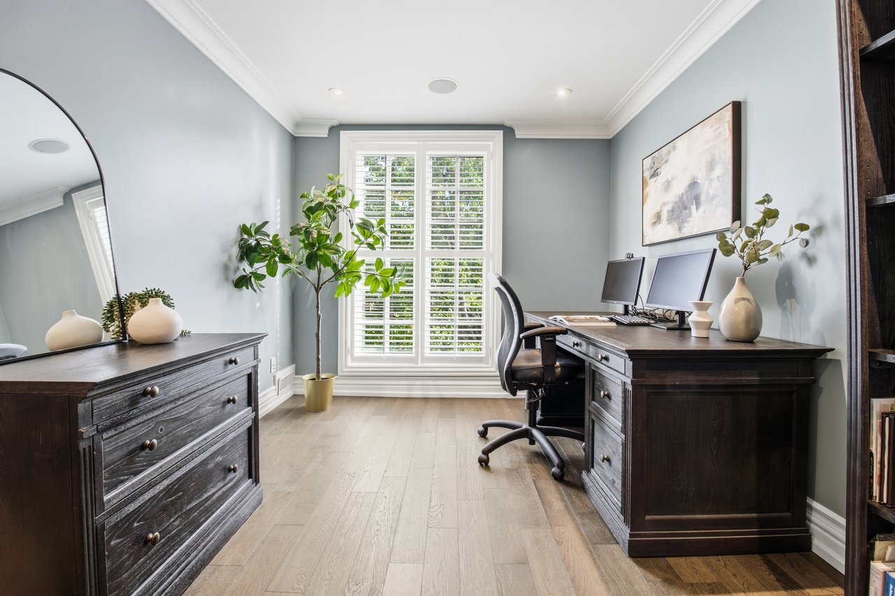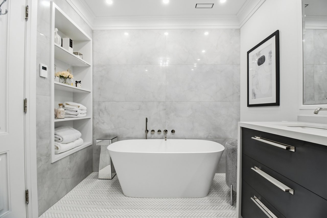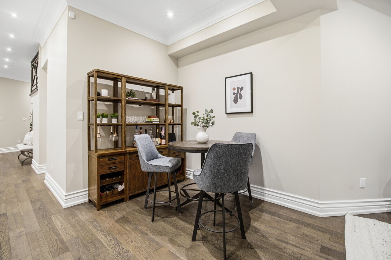 comfort, featuring soaring ceilings, detailed mouldings, bright living spaces . The main floor offers a spacious living and dining area, perfect for entertaining with a wood-burning fireplace, alongside a spacious chef's kitchen with Caesarstone Quartz Counters and backsplash (2020). Upstairs, you'll find three bright and spacious bedrooms with ample storage, including a luxurious primary retreat with a wood-burning fireplace and a lavish 5-piece ensuite with heated marble tile floors and a double vanity, fully renovated in 2023. The versatile lower level includes an