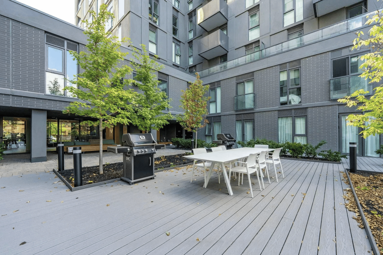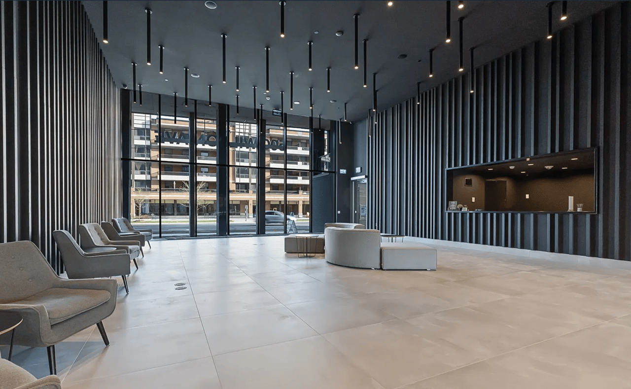 complemented by laminate flooring throughout for a clean, contemporary feel. The primary bedroom includes a private ensuite, and both bedrooms have proper windows and closets. One underground parking space included. Residents have access to full-service amenities including 24-hour concierge, fitness centre with yoga studio, co-working and lounge spaces, party room, outdoor BBQ areas, children's play spaces, and pet-friendly facilities including a pet wash station. Conveniently located steps to daily essentials and transit, with quick access to