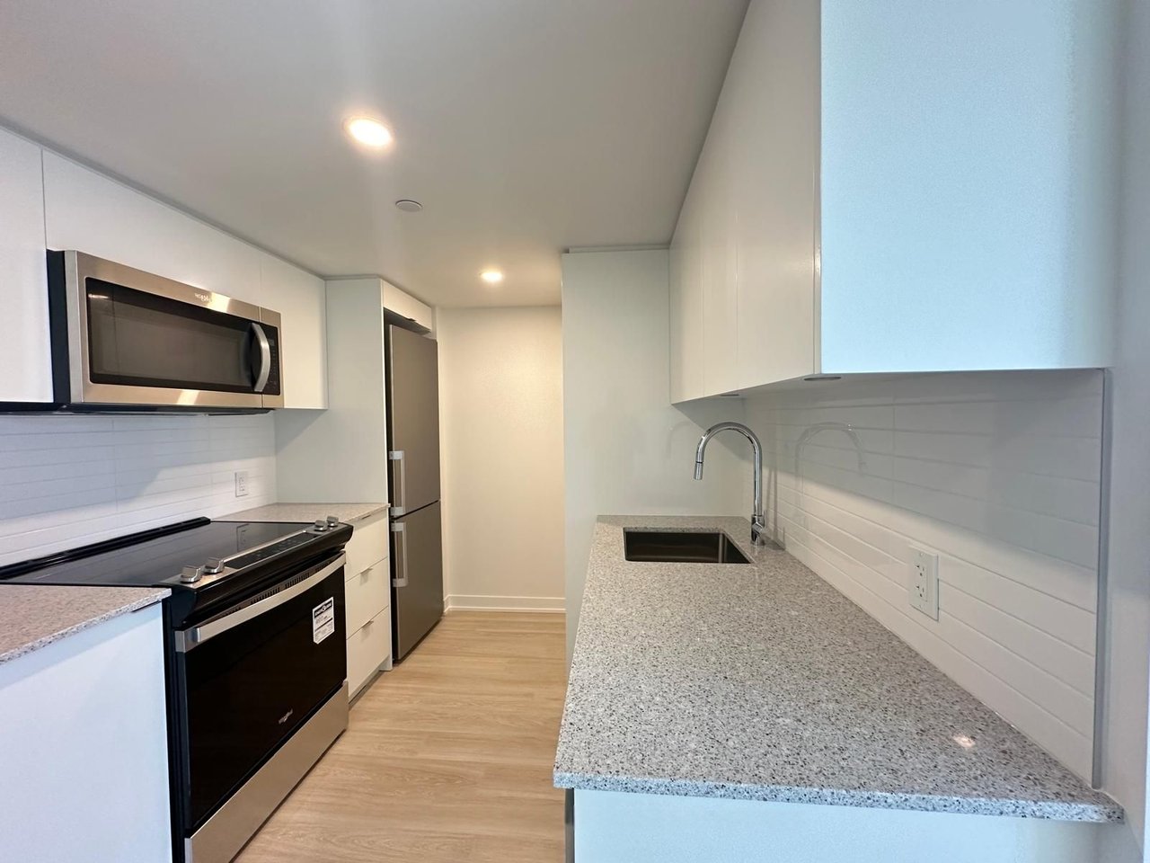 Well laid out 2-bedroom, 2-bathroom condo offering a smart, functional layout and excellent natural light in a well-managed building. Just under 600 sq ft with no wasted space, ideal for roommates or professionals seeking separation between bedrooms. The open living area connects to a west-facing balcony, bringing in strong afternoon light. The kitchen features quartz countertops, stainless steel appliances, and modern finishes,