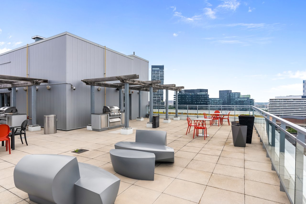 the space with natural light and showcase breathtaking sunset views over the city. Step out onto your private terrace (complete with a gas hookup for BBQ) - an ideal spot for morning coffee, evening drinks, or simply unwinding while taking in the skyline. The sun-drenched kitchen is