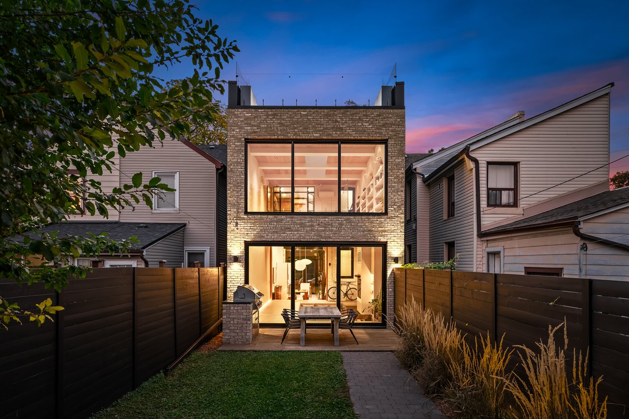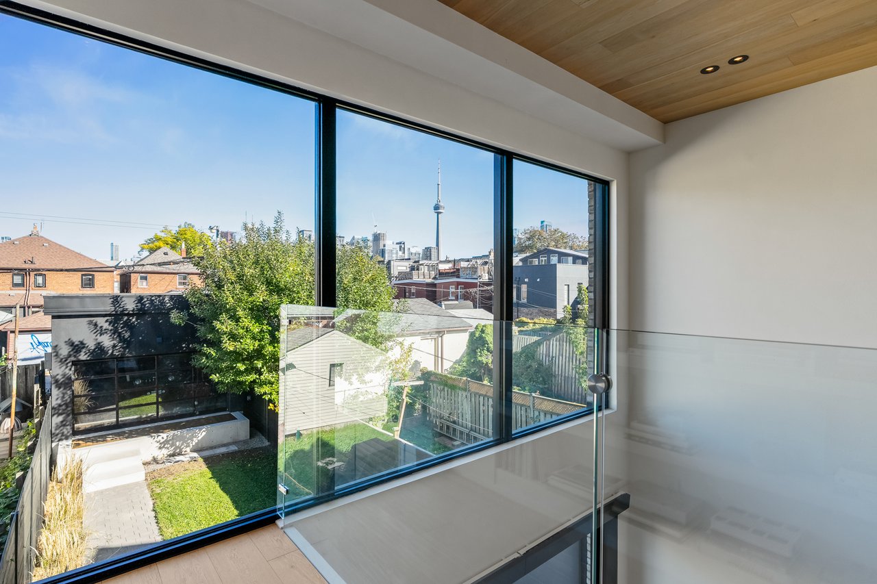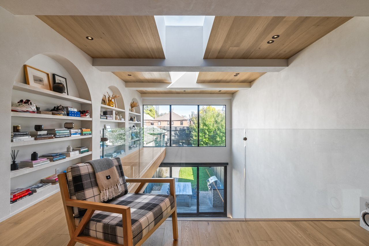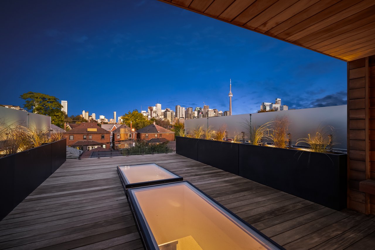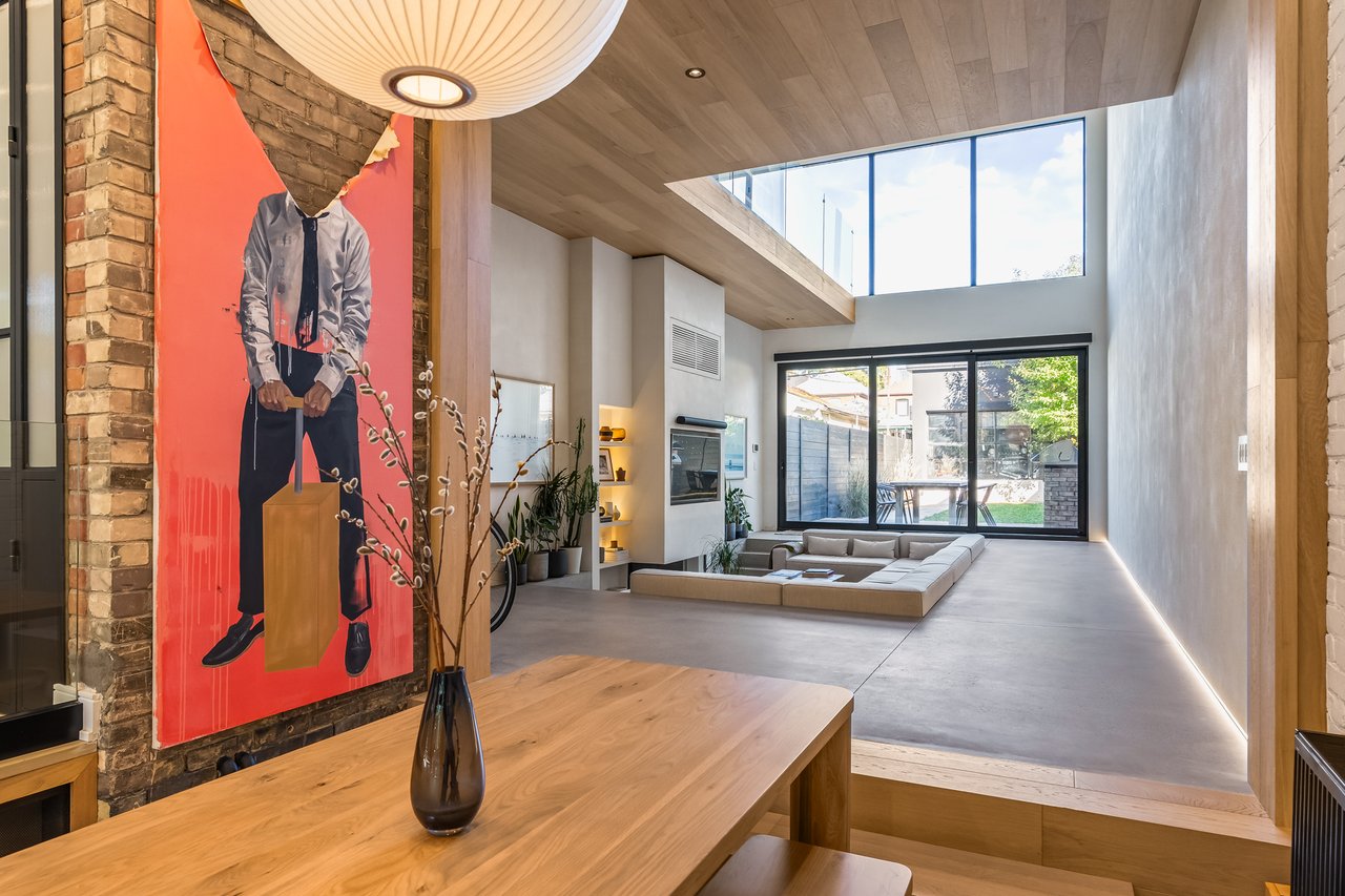 Discover an extraordinary architectural residence on Palmerston Avenue, one of Trinity Bellwoods' most sought-after streets. With history dating back to the 1860s, the home has gone through an extensive transformation, including a remarkable custom addition crafted by Whitaker Construction, a firm widely regarded as one of the city's leading builders, elevating it into a true design landmark. Featured earlier this year in the Toronto Star in an article titled "Is this the coolest living room in Toronto?" the answer is, yes. The main living space showcases striking 20-foot ceilings anchored by a sprawling sunken lounge, designed with a clean aesthetic that blends warmth with modern design. With east and west exposure, the combination of floor-to-ceiling glass and two large skylights allows natural light to pour through the entire home. The property features meticulous millwork in natural oak, micro-cement walls, heated concrete floors, and recessed lighting that together create a sense of calm sophistication. A beautifully designed mezzanine level, part of the custom addition, overlooks the main living space and features a serene library with arched custom shelving, creating an inspiring, light-filled vantage point with views of the city skyline. This thoughtfully planned 3-bedroom residence includes an entire third level dedicated to the primary retreat, featuring a spa-like ensuite that extends to an expansive private rooftop terrace, partially covered and perfectly positioned for Toronto skyline and CN Tower views. An oversized double-sided 1.5 car garage provides exceptional functionality, accommodating two smaller vehicles or offering ample additional space. The lower level includes a washroom and a dedicated area ideal for storage. Celebrating craftsmanship and innovation at every turn, every element has been curated with exceptional intention, resulting in a home that is both artful and livable, an inspired piece of architecture rarely found in the city.