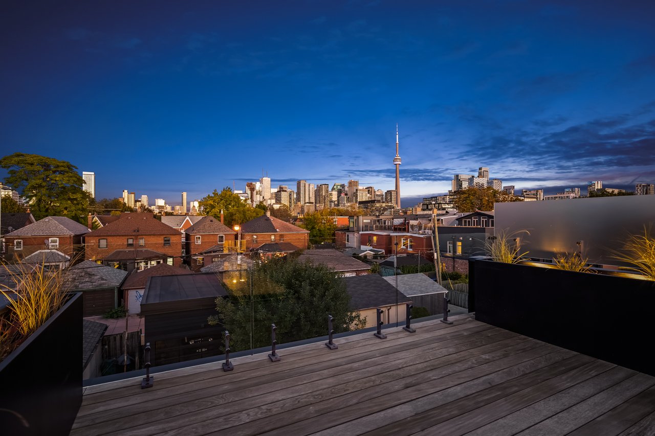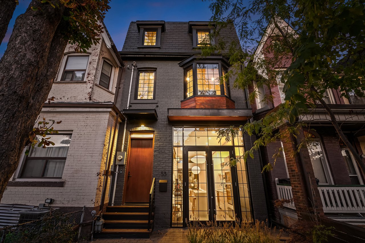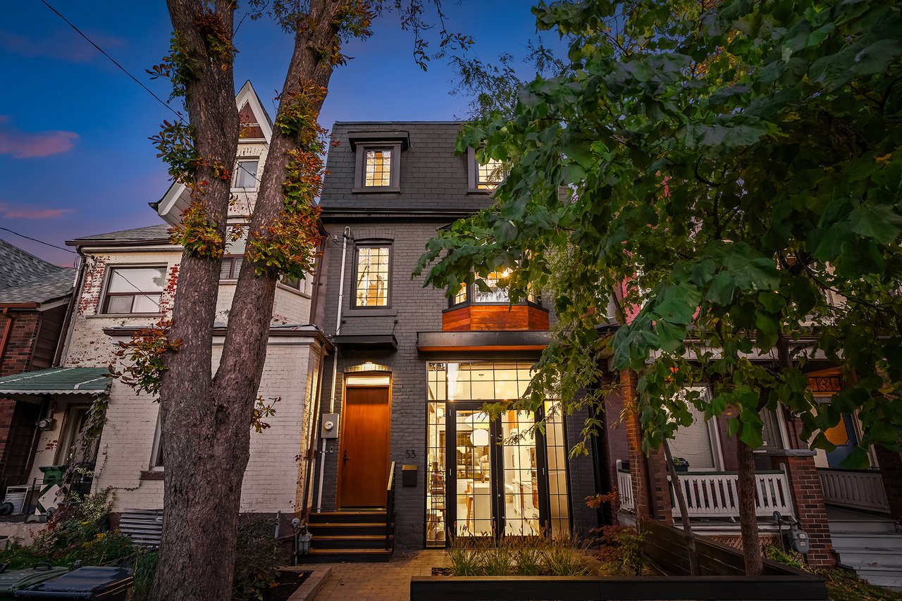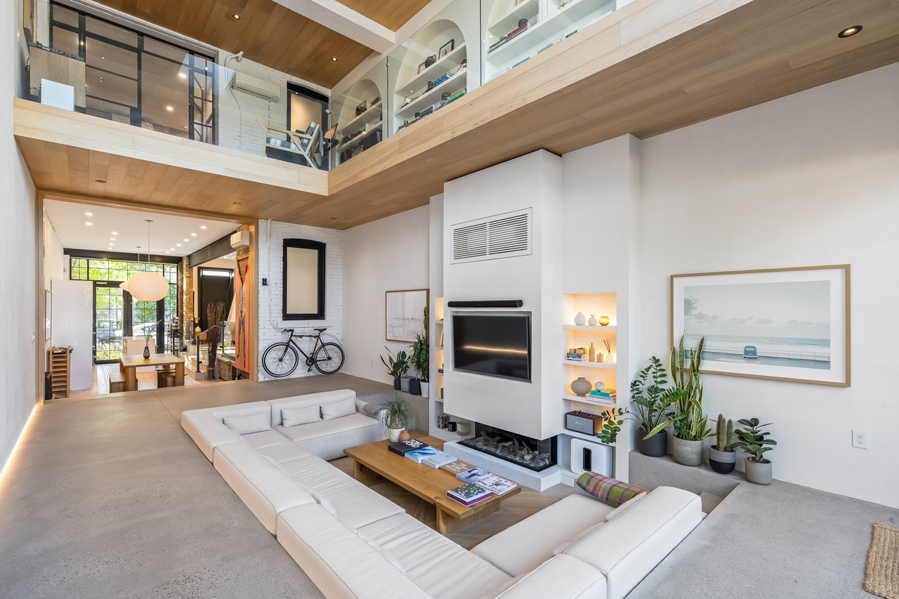 Discover an extraordinary architectural residence on Palmerston Avenue, one of Trinity Bellwoods' most sought-after streets. With history dating back to the 1860s, the home has gone through an extensive transformation, including a remarkable custom addition crafted by Whitaker Construction, a firm widely regarded as one of the city's leading builders, elevating it into a true design landmark. Featured earlier this year in the Toronto Star in an article titled "Is this the coolest living room in Toronto?" the answer is, yes. The main living space showcases striking 20-foot ceilings anchored by a sprawling sunken lounge, designed with a clean aesthetic that blends warmth with modern design. With east and west exposure, the combination of floor-to-ceiling glass and two large skylights allows natural light to pour through the entire home. The property features meticulous millwork in natural oak, micro-cement walls, heated concrete floors, and recessed lighting that together create a sense of calm sophistication. A beautifully designed mezzanine level, part of the custom addition, overlooks the main living space and features a serene library with arched custom shelving, creating an inspiring, light-filled vantage point with views of the city skyline. This thoughtfully planned 3-bedroom residence includes an entire third level dedicated to the primary retreat, featuring a spa-like ensuite that extends to an expansive private rooftop terrace, partially covered and perfectly positioned for Toronto skyline and CN Tower views. An oversized double-sided 1.5 car garage provides exceptional functionality, accommodating two smaller vehicles or offering ample additional space. The lower level includes a washroom and a dedicated area ideal for storage. Celebrating craftsmanship and innovation at every turn, every element has been curated with exceptional intention, resulting in a home that is both artful and livable, an inspired piece of architecture rarely found in the city.