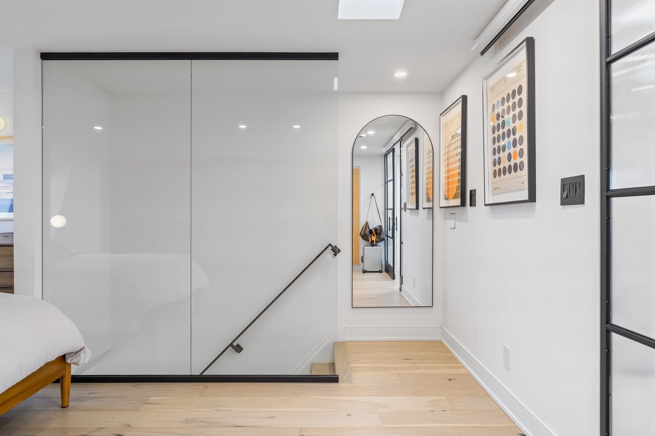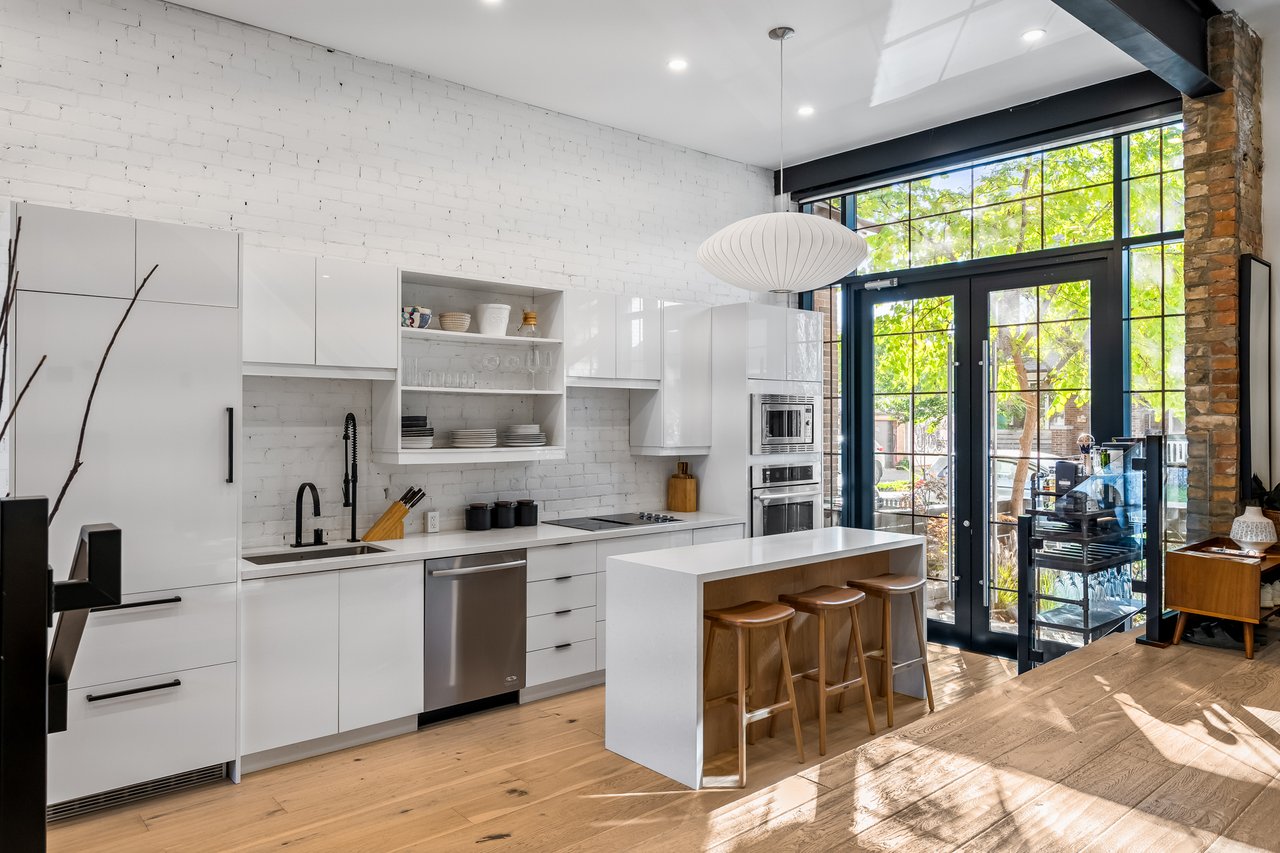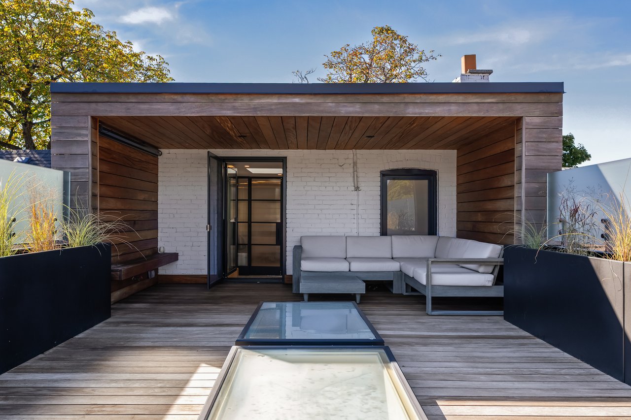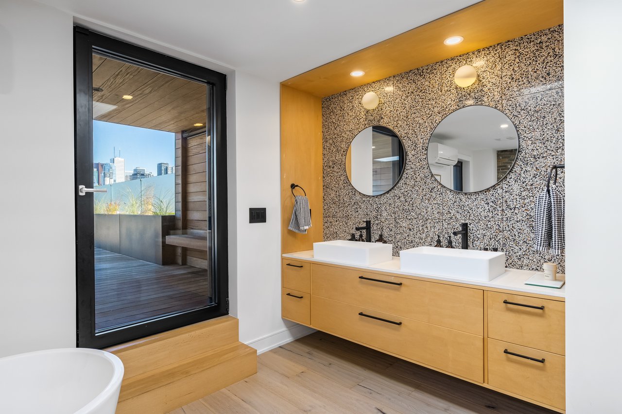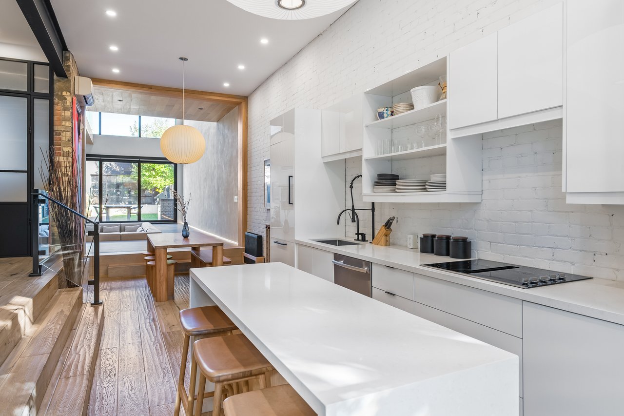 Discover an extraordinary architectural residence on Palmerston Avenue, one of Trinity Bellwoods' most sought-after streets. With history dating back to the 1860s, the home has gone through an extensive transformation, including a remarkable custom addition crafted by Whitaker Construction, a firm widely regarded as one of the city's leading builders, elevating it into a true design landmark. Featured earlier this year in the Toronto Star in an article titled "Is this the coolest living room in Toronto?" the answer is, yes. The main living space showcases striking 20-foot ceilings anchored by a sprawling sunken lounge, designed with a clean aesthetic that blends warmth with modern design. With east and west exposure, the combination of floor-to-ceiling glass and two large skylights allows natural light to pour through the entire home. The property features meticulous millwork in natural oak, micro-cement walls, heated concrete floors, and recessed lighting that together create a sense of calm sophistication. A beautifully designed mezzanine level, part of the custom addition, overlooks the main living space and features a serene library with arched custom shelving, creating an inspiring, light-filled vantage point with views of the city skyline. This thoughtfully planned 3-bedroom residence includes an entire third level dedicated to the primary retreat, featuring a spa-like ensuite that extends to an expansive private rooftop terrace, partially covered and perfectly positioned for Toronto skyline and CN Tower views. An oversized double-sided 1.5 car garage provides exceptional functionality, accommodating two smaller vehicles or offering ample additional space. The lower level includes a washroom and a dedicated area ideal for storage. Celebrating craftsmanship and innovation at every turn, every element has been curated with exceptional intention, resulting in a home that is both artful and livable, an inspired piece of architecture rarely found in the city.