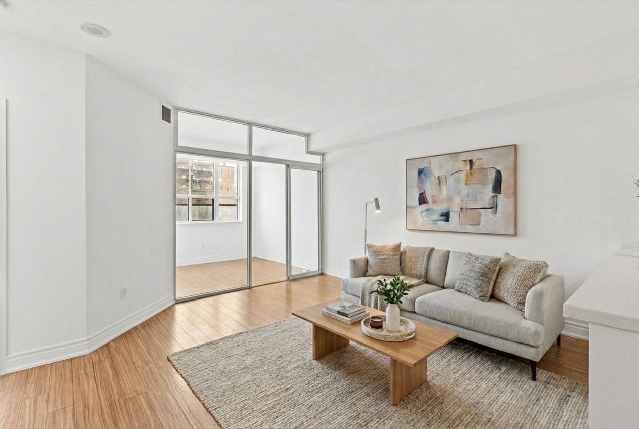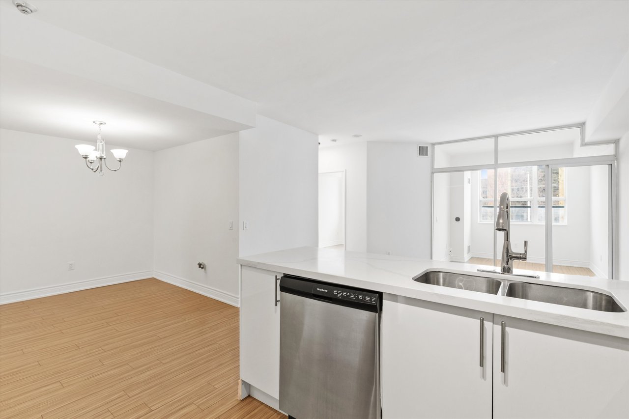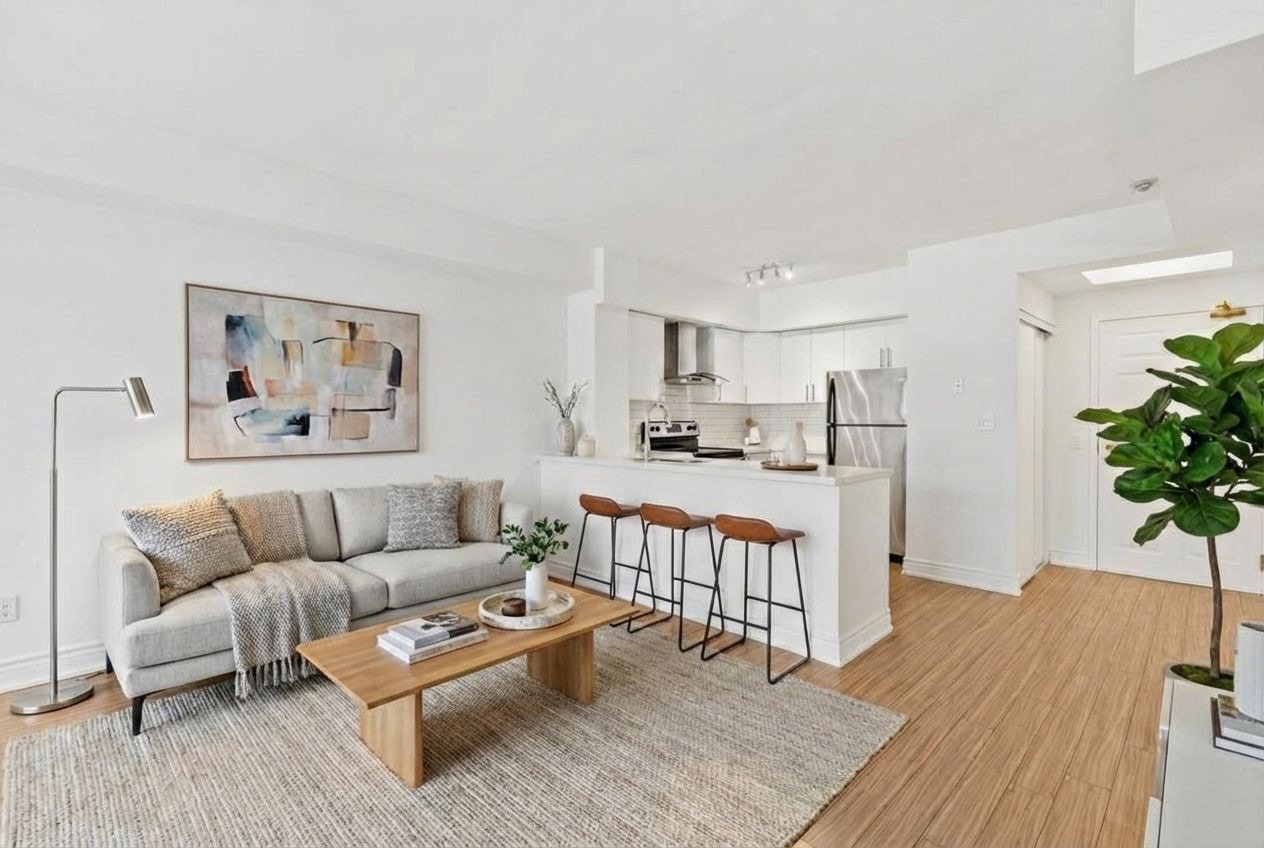Presenting a superb 1-bedroom + den condo set along the Yonge Street corridor in an established Thornhill community. A perfectly proportioned and planned layout offers generously sized principal rooms, plus a glass-enclosed den that can easily function as a second bedroom or home office - ideal for a single professional, couple, or young family seeking a smart and flexible living space. This unit features a beautifully updated and highly functional kitchen with expansive quartz countertops, full-size stainless steel appliances, a subway tile backsplash, and a practical double sink, blending modern style with timeless appeal. Open-concept living shines here, with the kitchen perfectly positioned to overlook both the dining and living areas, creating an inviting space for entertaining and everyday life. Large sliding glass doors in both the bedroom and den lead to a full-length balcony, seamlessly extending your living space outdoors. Freshly updated throughout with new paint, smooth plaster ceilings, LED light fixtures, custom roller blinds, a new kitchen faucet, an updated bathroom mirror, and the convenience of an ensuite washer and dryer, the unit also includes one underground parking space and a storage locker. Situated in a prime Yonge Street location just steps to groceries, restaurants, cafés, and community services, residents also enjoy excellent connectivity with easy access to transit and major roadways. Set within an established, family-friendly community known for its stable and desirable neighbourhood feel, the area features a pleasant mix of townhomes, detached homes, and condominiums surrounded by mature landscaping.