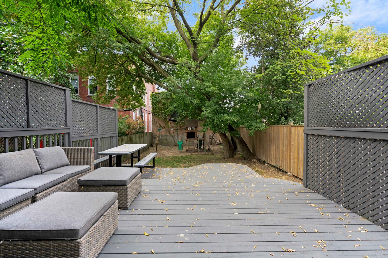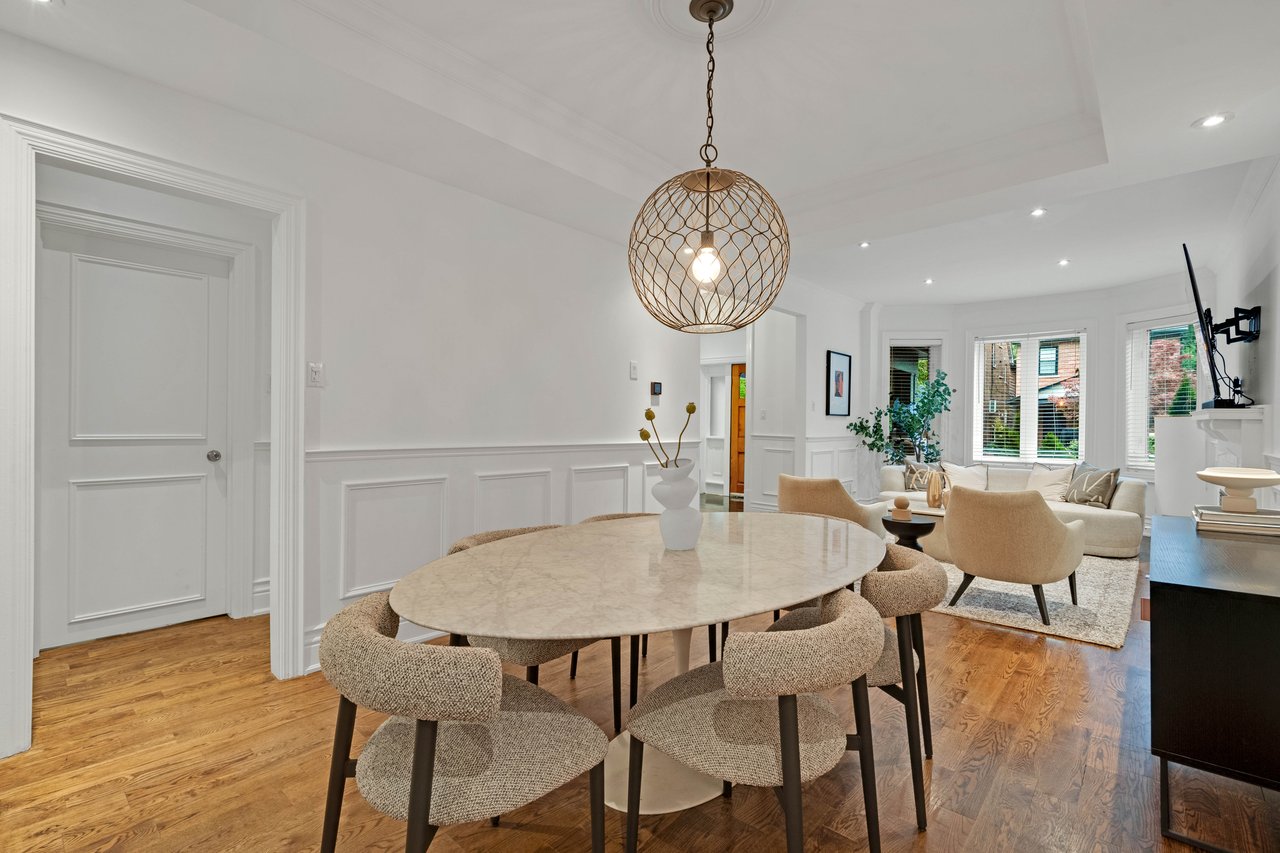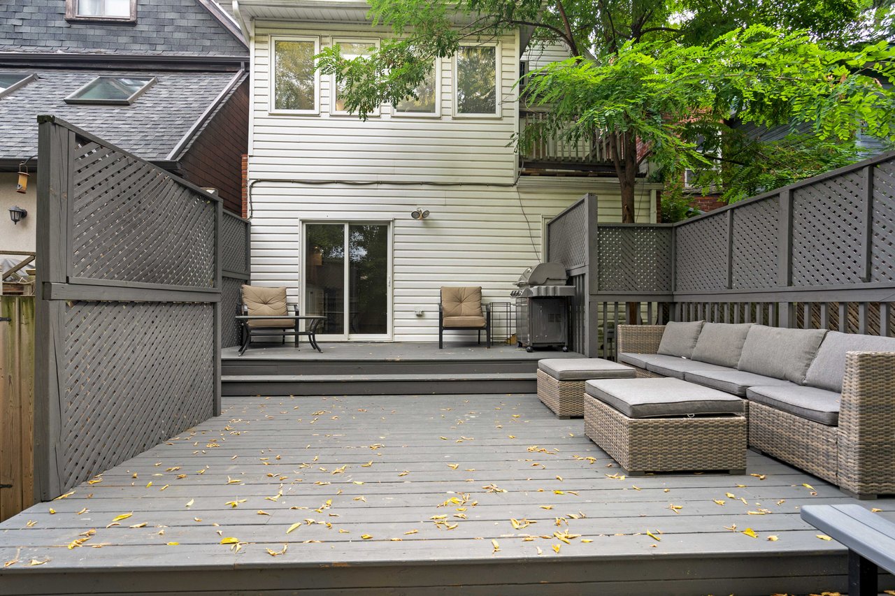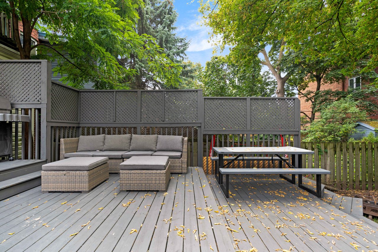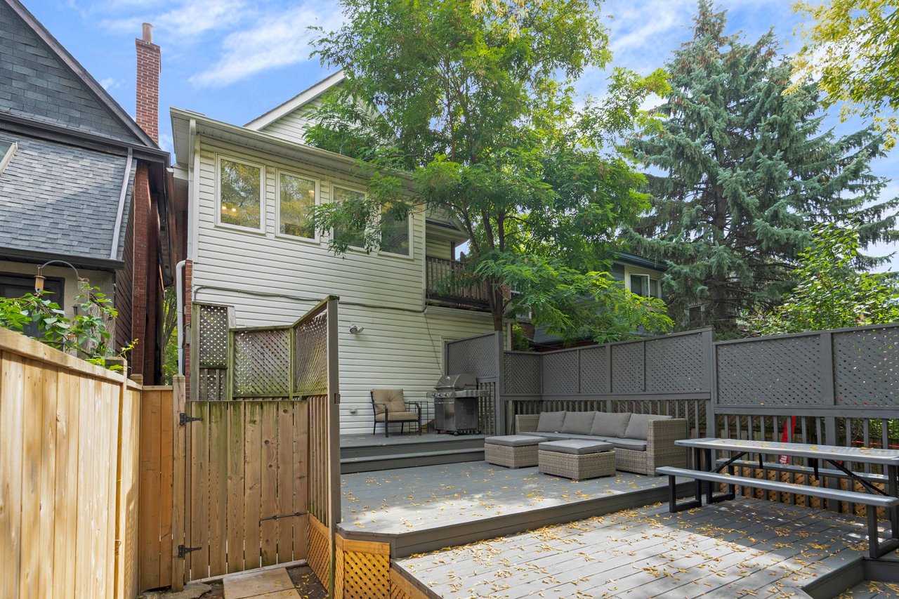 Welcome to this beautiful and updated family home in the prestigious Casa Loma neighbourhood. Blending classic Victorian charm with modern upgrades, this residence offers elegance, warmth, and convenience in one of Toronto's most sought-after communities. A tiled entryway with hall closet leads into a spacious living and dining area featuring dark hardwood floors, crown moulding's, chair rails, and wainscoting throughout. The living room includes a fireplace and large windows, seamlessly connected to the Victorian-inspired dining room with chandelier. The custom kitchen boasts granite countertops, built-in storage, a centre island with bar seating, and high-end appliances including a GE Profile fridge, Bosch dishwasher, GE electric stove/oven, and crown hood fan. A breakfast area with window and a walkout to the deck and private backyard complete this level. A convenient 2-piece bath and access to the basement are located off the central hallway. Upstairs features hardwood flooring and a primary suite with walk-in closet, a 6-piece ensuite surrounded by windows, and a walkout to a private deck. A second bedroom offers a fireplace, windows, and access to an adjoining room ideal for an office or sitting area. A 3-piece bathroom completes this level. The top floor, accessible via stairs with a charming skylight, includes two additional bedrooms with closets and windows, connected by a Jack-and-Jill 4-piece bathroom with skylight. The lower level features a side entrance, recreation room with windows, additional bedroom, 4-piece bathroom with laundry, storage areas (including under-stair storage), and utility room. Dark hardwood flooring adds warmth to the space. Situated steps from Casa Loma, local parks, playgrounds, shops, restaurants, and public transit, this home is perfect for families seeking a balance of heritage, comfort, and accessibility.