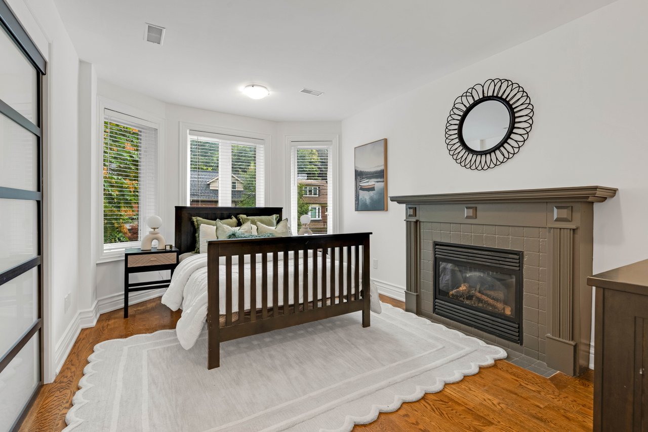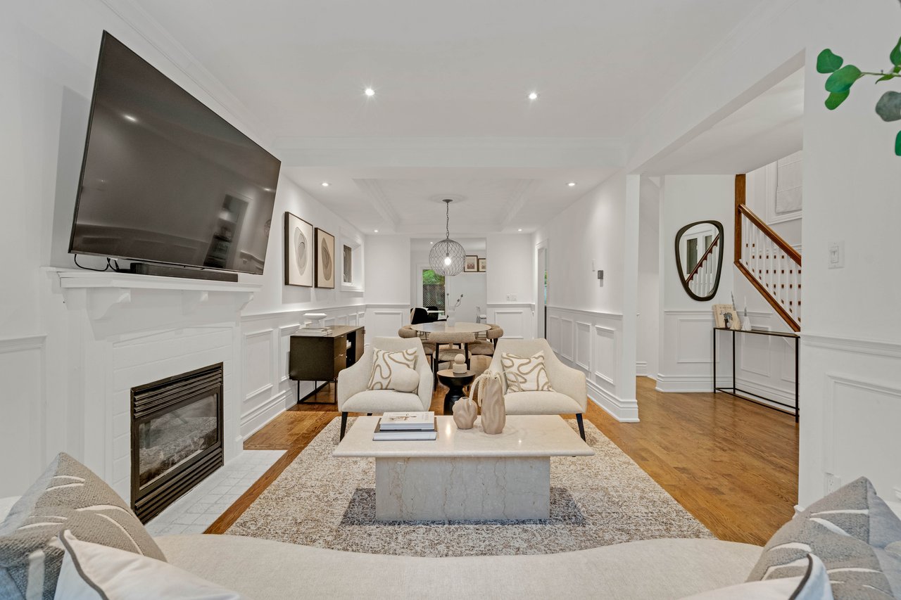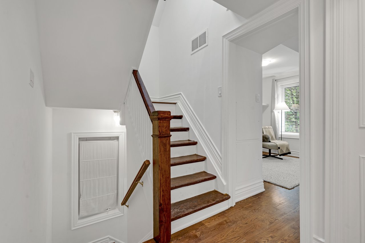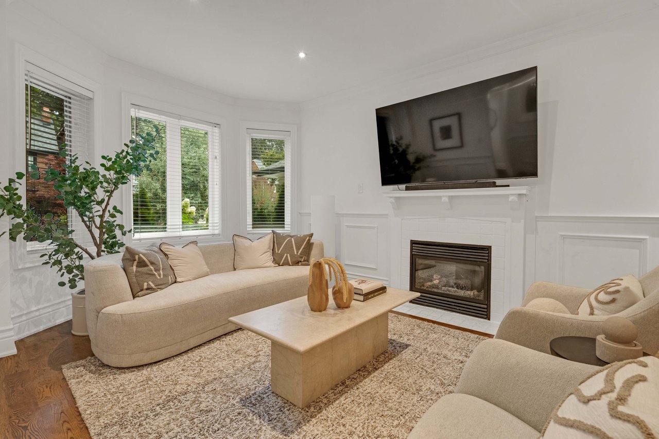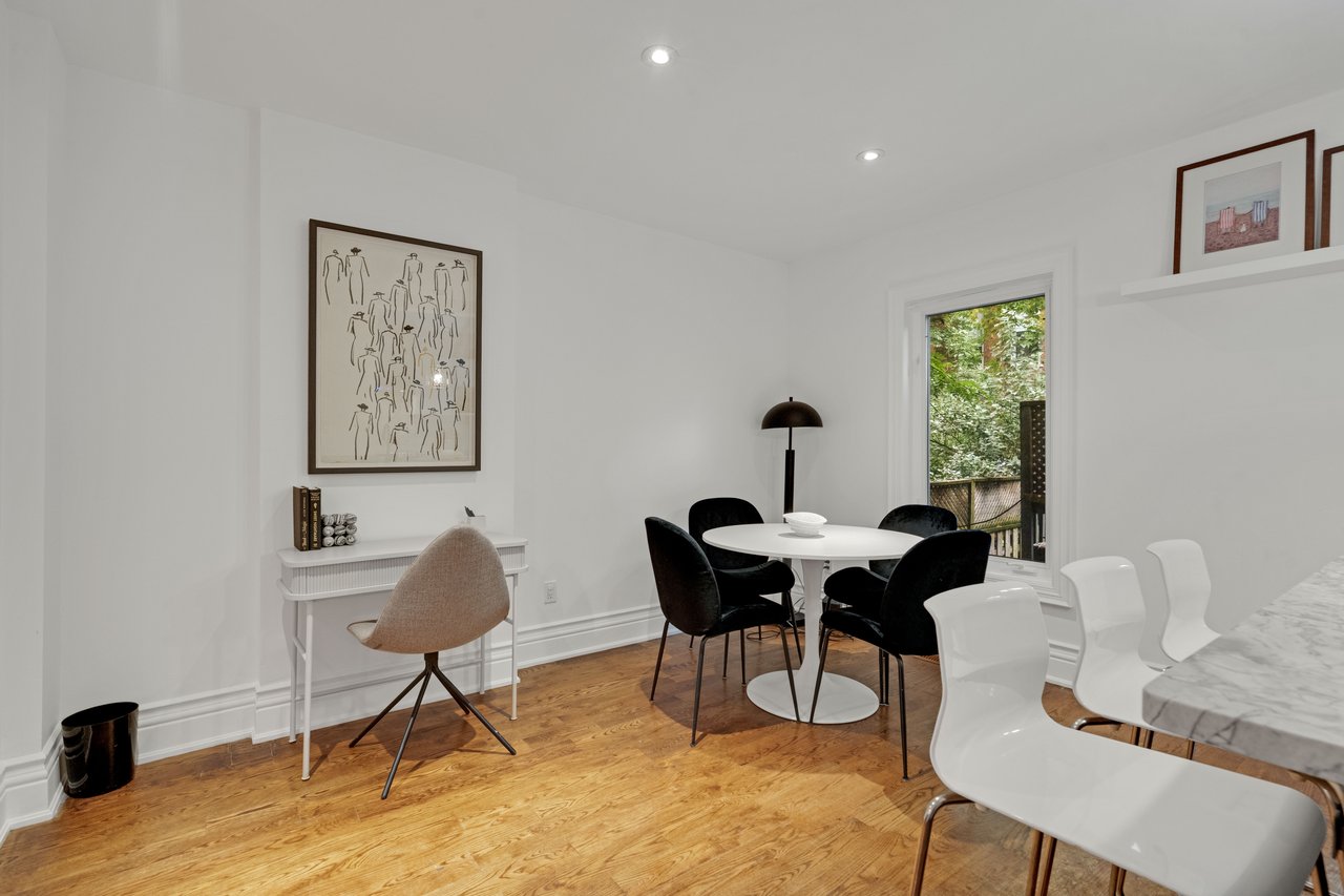 Welcome to this beautiful and updated family home in the prestigious Casa Loma neighbourhood. Blending classic Victorian charm with modern upgrades, this residence offers elegance, warmth, and convenience in one of Toronto's most sought-after communities. A tiled entryway with hall closet leads into a spacious living and dining area featuring dark hardwood floors, crown moulding's, chair rails, and wainscoting throughout. The living room includes a fireplace and large windows, seamlessly connected to the Victorian-inspired dining room with chandelier. The custom kitchen boasts granite countertops, built-in storage, a centre island with bar seating, and high-end appliances including a GE Profile fridge, Bosch dishwasher, GE electric stove/oven, and crown hood fan. A breakfast area with window and a walkout to the deck and private backyard complete this level. A convenient 2-piece bath and access to the basement are located off the central hallway. Upstairs features hardwood flooring and a primary suite with walk-in closet, a 6-piece ensuite surrounded by windows, and a walkout to a private deck. A second bedroom offers a fireplace, windows, and access to an adjoining room ideal for an office or sitting area. A 3-piece bathroom completes this level. The top floor, accessible via stairs with a charming skylight, includes two additional bedrooms with closets and windows, connected by a Jack-and-Jill 4-piece bathroom with skylight. The lower level features a side entrance, recreation room with windows, additional bedroom, 4-piece bathroom with laundry, storage areas (including under-stair storage), and utility room. Dark hardwood flooring adds warmth to the space. Situated steps from Casa Loma, local parks, playgrounds, shops, restaurants, and public transit, this home is perfect for families seeking a balance of heritage, comfort, and accessibility.
