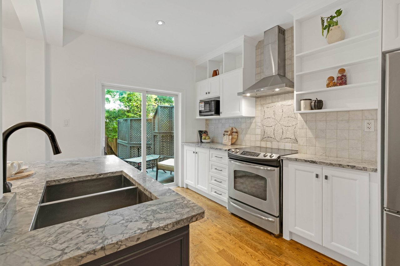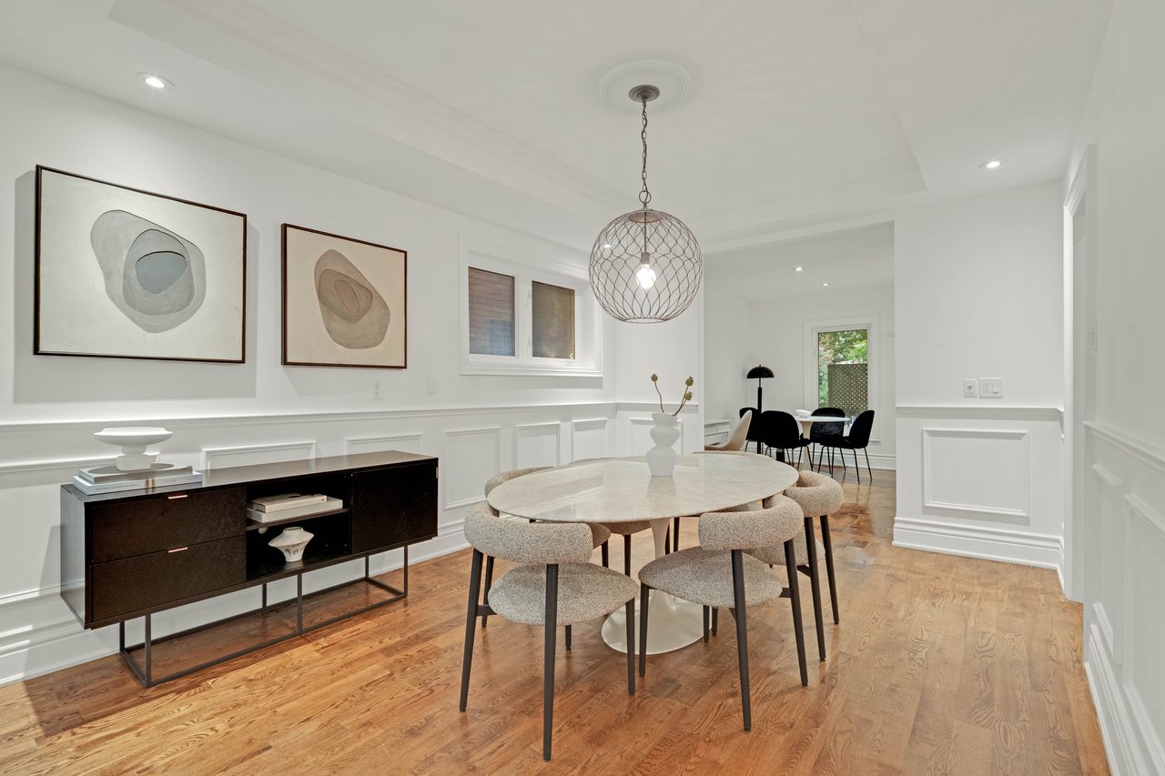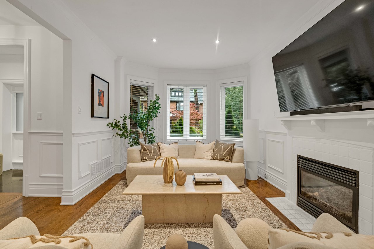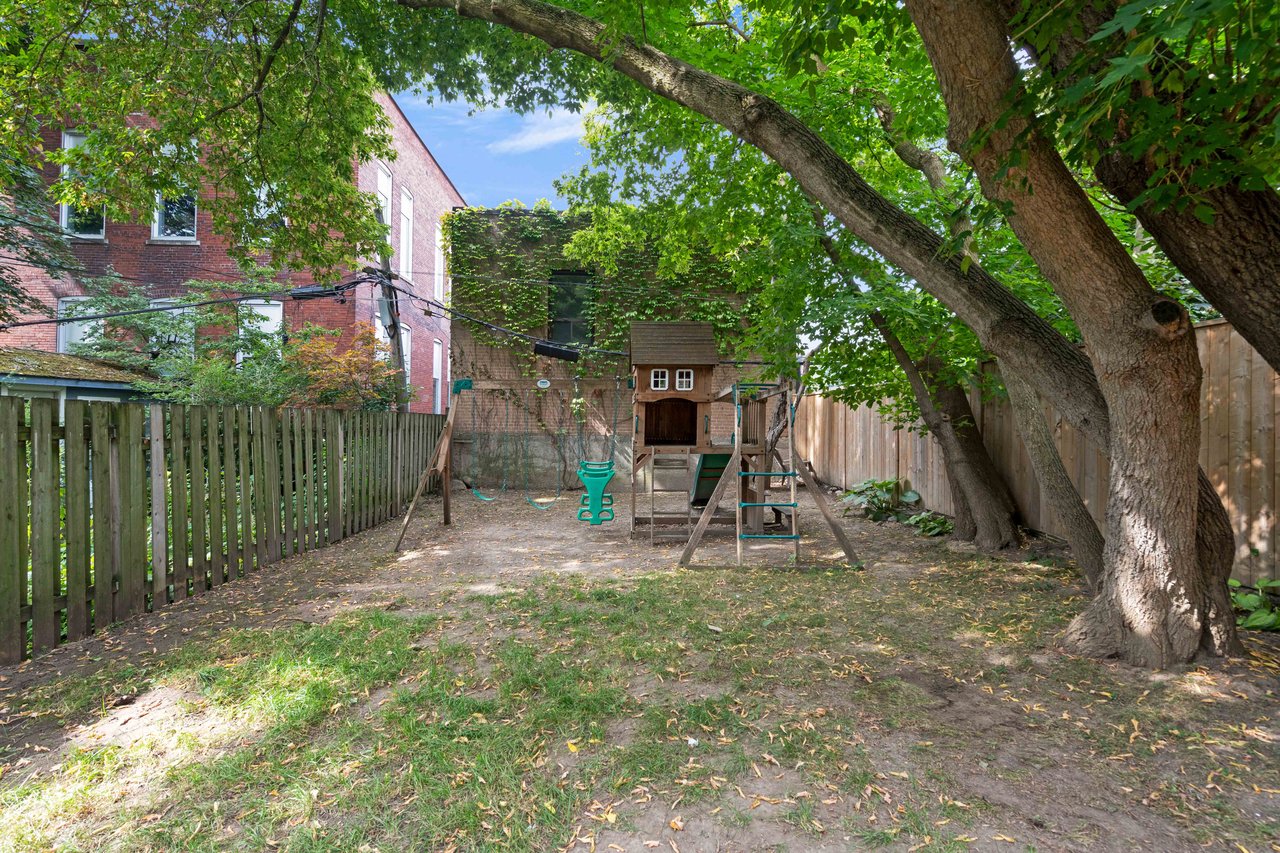 Welcome to this beautiful and updated family home in the prestigious Casa Loma neighbourhood. Blending classic Victorian charm with modern upgrades, this residence offers elegance, warmth, and convenience in one of Toronto's most sought-after communities. A tiled entryway with hall closet leads into a spacious living and dining area featuring dark hardwood floors, crown moulding's, chair rails, and wainscoting throughout. The living room includes a fireplace and large windows, seamlessly connected to the Victorian-inspired dining room with chandelier. The custom kitchen boasts granite countertops, built-in storage, a centre island with bar seating, and high-end appliances including a GE Profile fridge, Bosch dishwasher, GE electric stove/oven, and crown hood fan. A breakfast area with window and a walkout to the deck and private backyard complete this level. A convenient 2-piece bath and access to the basement are located off the central hallway. Upstairs features hardwood flooring and a primary suite with walk-in closet, a 6-piece ensuite surrounded by windows, and a walkout to a private deck. A second bedroom offers a fireplace, windows, and access to an adjoining room ideal for an office or sitting area. A 3-piece bathroom completes this level. The top floor, accessible via stairs with a charming skylight, includes two additional bedrooms with closets and windows, connected by a Jack-and-Jill 4-piece bathroom with skylight. The lower level features a side entrance, recreation room with windows, additional bedroom, 4-piece bathroom with laundry, storage areas (including under-stair storage), and utility room. Dark hardwood flooring adds warmth to the space. Situated steps from Casa Loma, local parks, playgrounds, shops, restaurants, and public transit, this home is perfect for families seeking a balance of heritage, comfort, and accessibility.